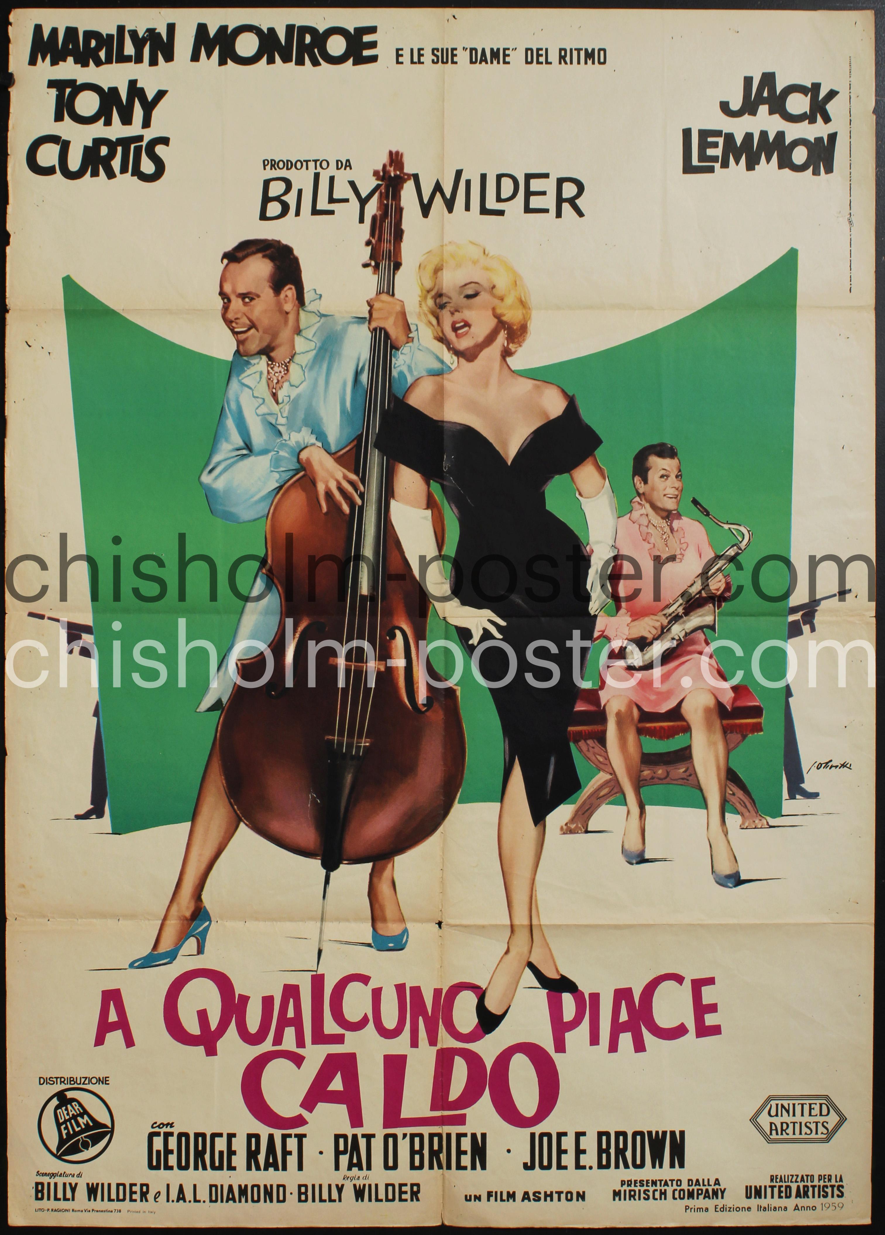 A 1961 re-release of the 1959 Some Like it Hot Italian poster. The artwork of the original is different and almost impossible to locate, worth around $5000. This older reprint bears the older United Artists logo and the Dear Film logo. Note: Some tears and paperloss at edge, good to very good condition.