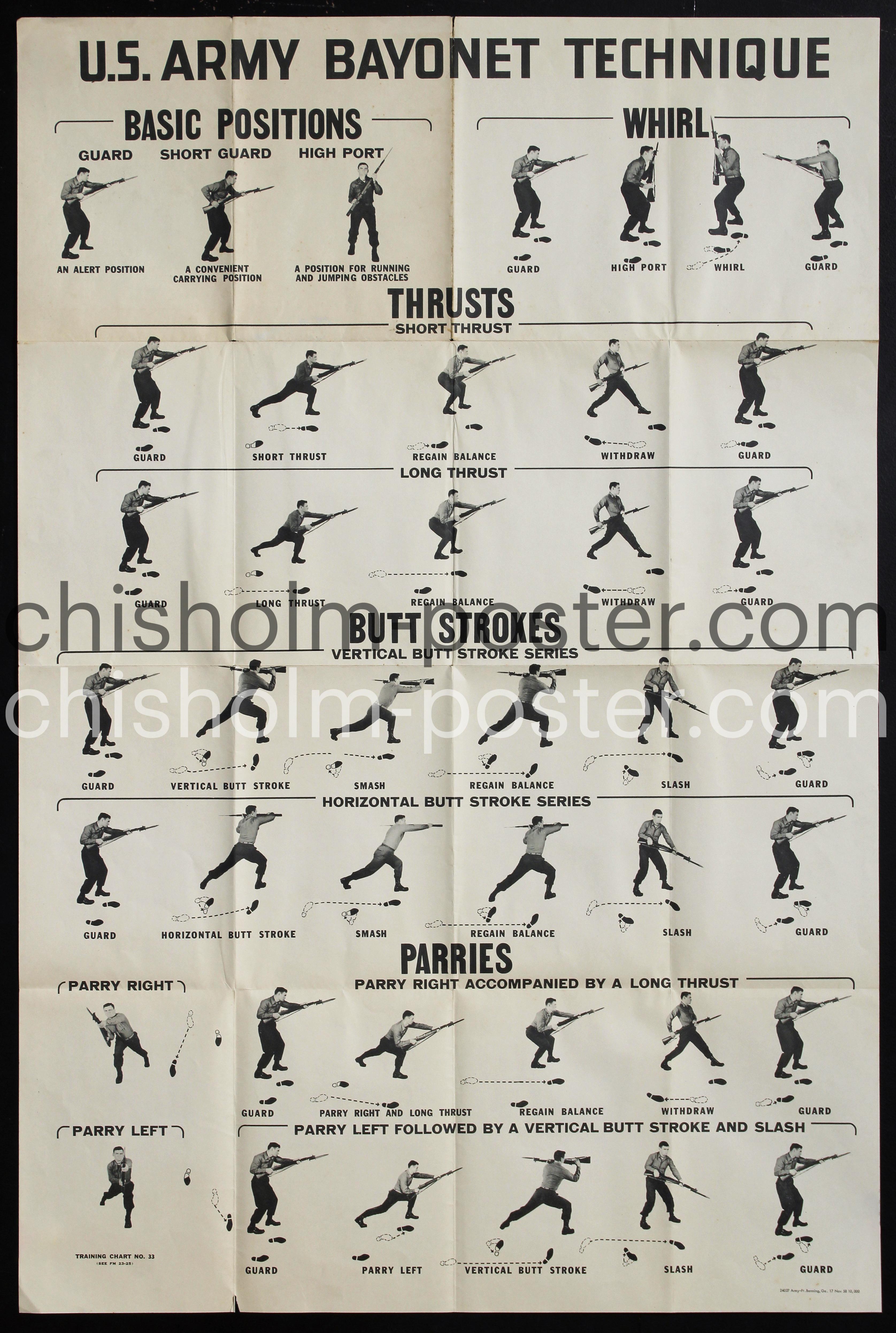 1958 US Army poster with educational illustrations showing the various techniques for using a bayonet with the titles: basic positions, whirl, thrusts, butt strokes, parries.
