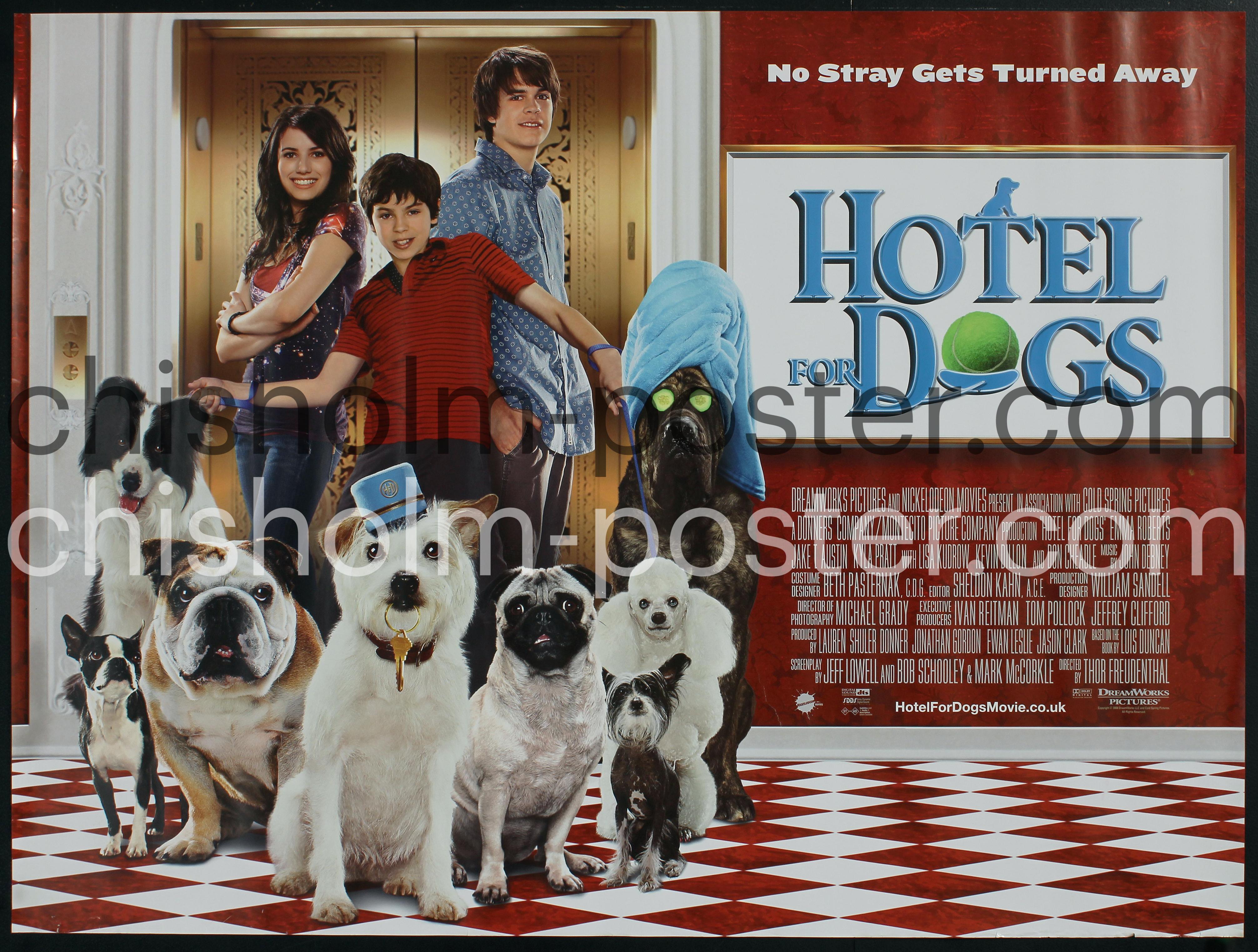 British release poster (British Quad sized) for HOTEL FOR DOGS, "a 2009 American family comedy film directed by Thor Freudenthal in his directorial debut, and based on the 1971 novel of the same name by Lois Duncan... the film tells the story of two orphaned siblings (living in foster care), who secretly take in stray dogs along with their family dog at a vacant hotel."
