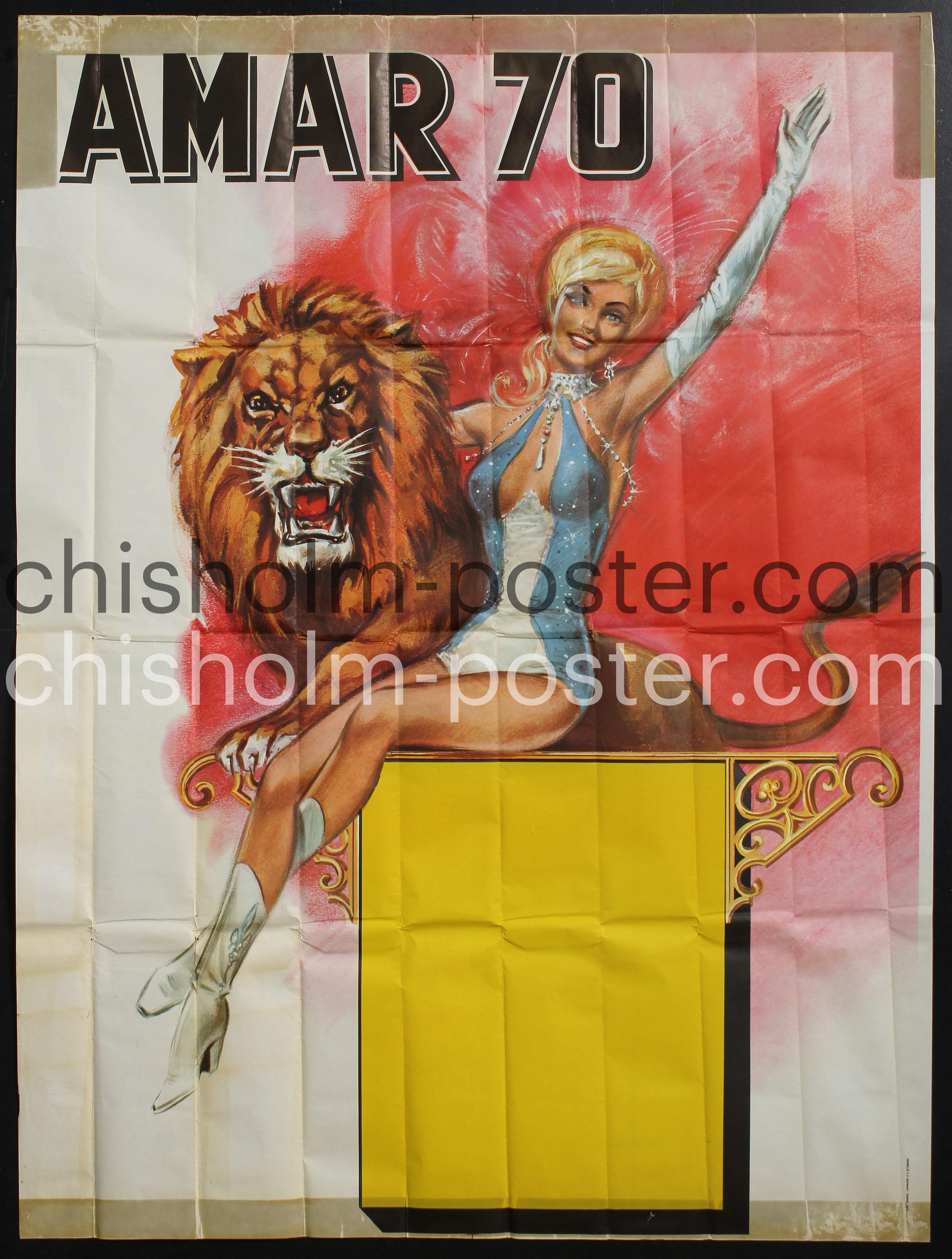 Poster of a lion and show girl for a French circus. NOTE: There is extensive tape at the top and bottom edges on the back of the poster that has stained the front. This area can be trimmed off if using as a decorative piece.