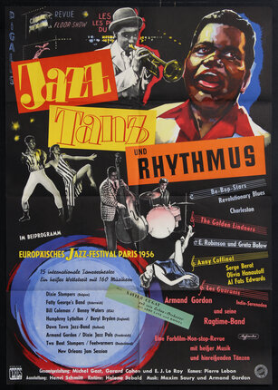 German release poster for a short 1958 French documentary film (Music-hall parade) about International Jazz with footage from the EUROPEAN JAZZ FESTIVAL in PARIS in 1956.