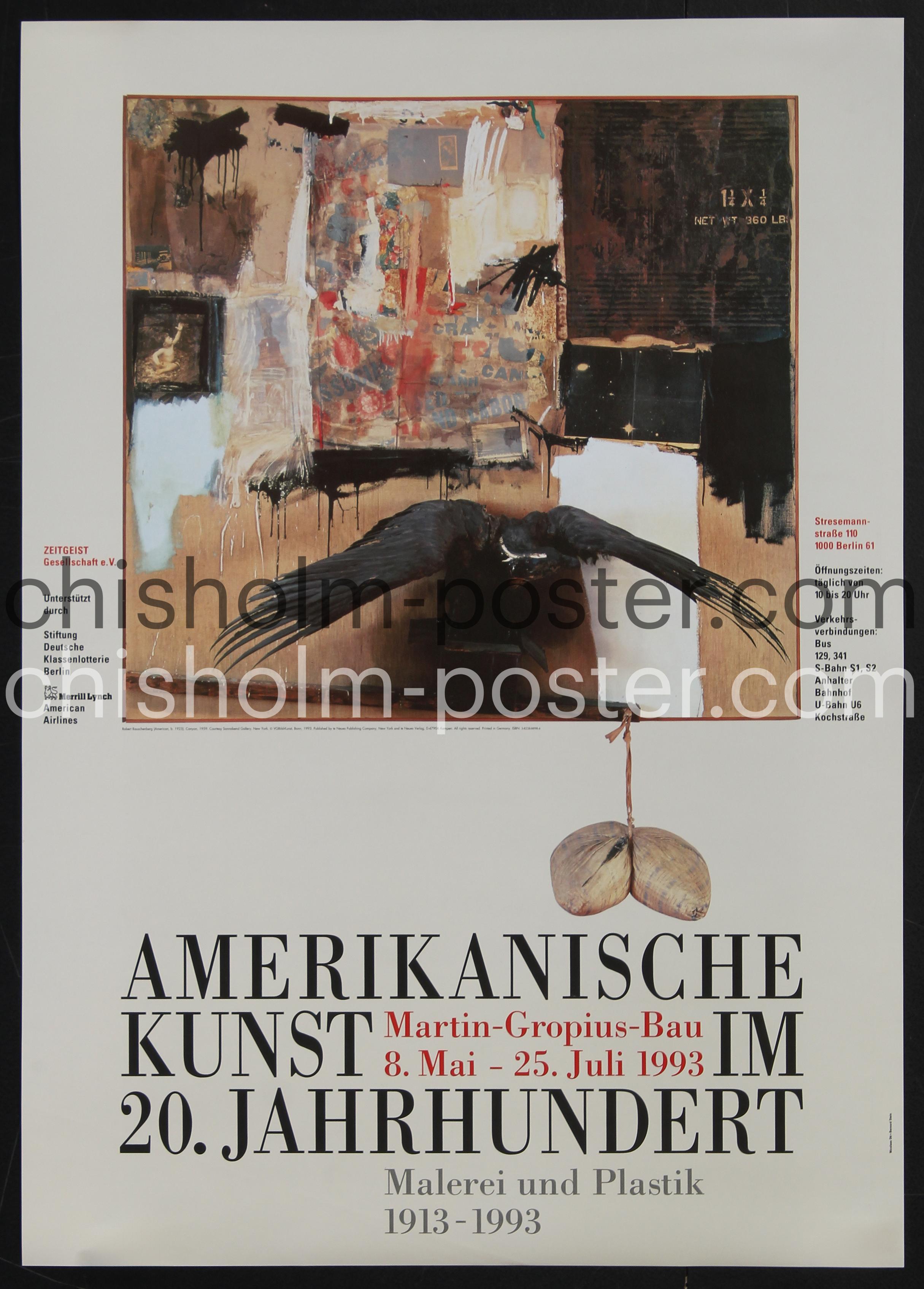 1993 Art exhibition poster for a show of American Art at the Martin-Gropius-Bau Museum in Berlin. Artwork is "Canyon" by Robert Rauschenberg.