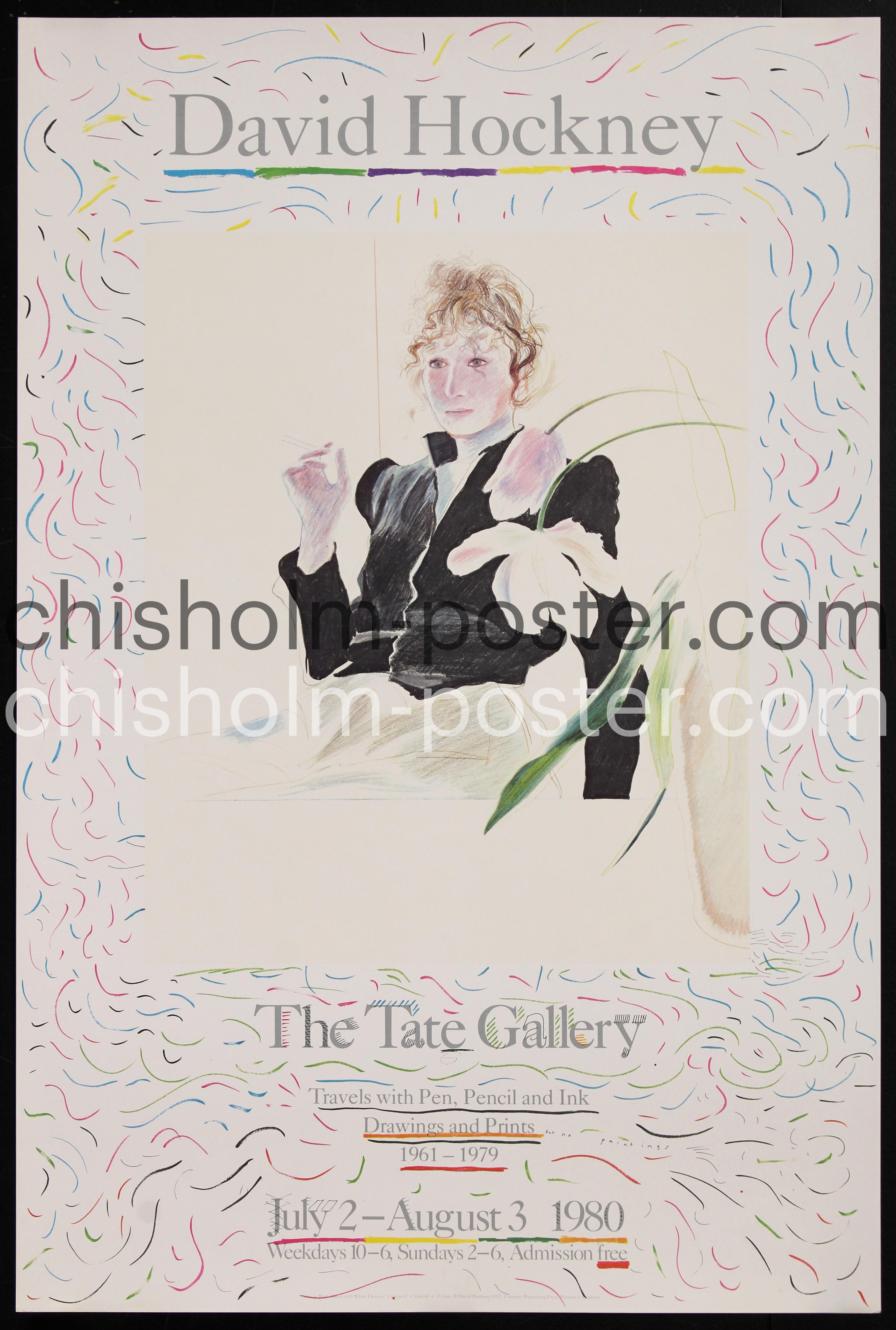 1980 Exhibition poster. David Hockney: Travels with Pen, Pencil and Ink Drawings and Prints 1961-1979 at The Tate (formally the National Gallery of British Art and the Tate Gallery). Artwork featured is "Celia in a Black Dress with White Flowers" from 1972.