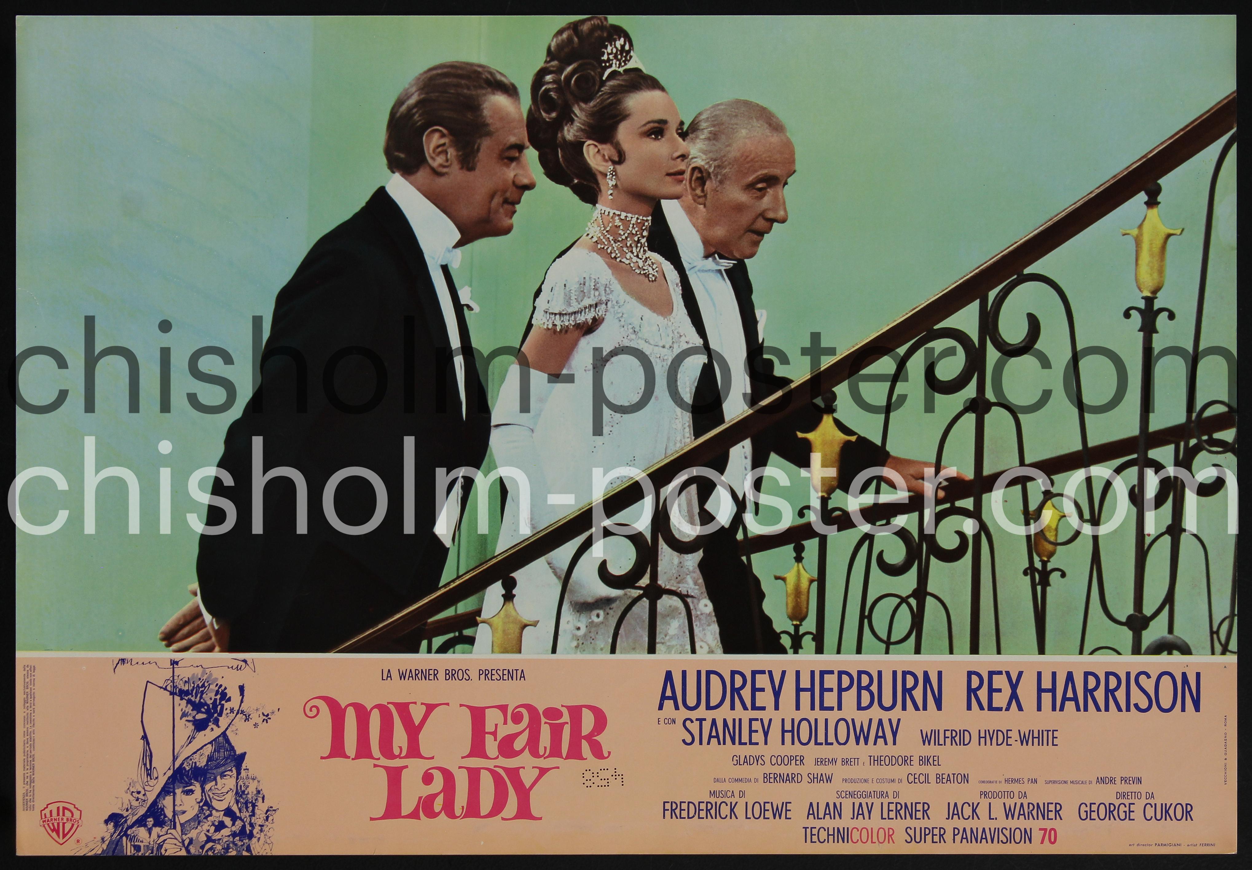 Italian release fotobusta poster for My Fair Lady, "a 1964 American musical comedy drama film adapted from the 1956 Lerner and Loewe stage musical based on George Bernard Shaw's 1913 stage play Pygmalion. With a screenplay by Alan Jay Lerner and directed by George Cukor, the film depicts a poor Cockney flower-seller named Eliza Doolittle who overhears a phonetics professor, Henry Higgins, as he casually wagers that he could teach her to speak English so well she could pass for a duchess in Edwardian London or better yet, from Eliza's viewpoint, secure employment in a flower shop." (Wikipedia)