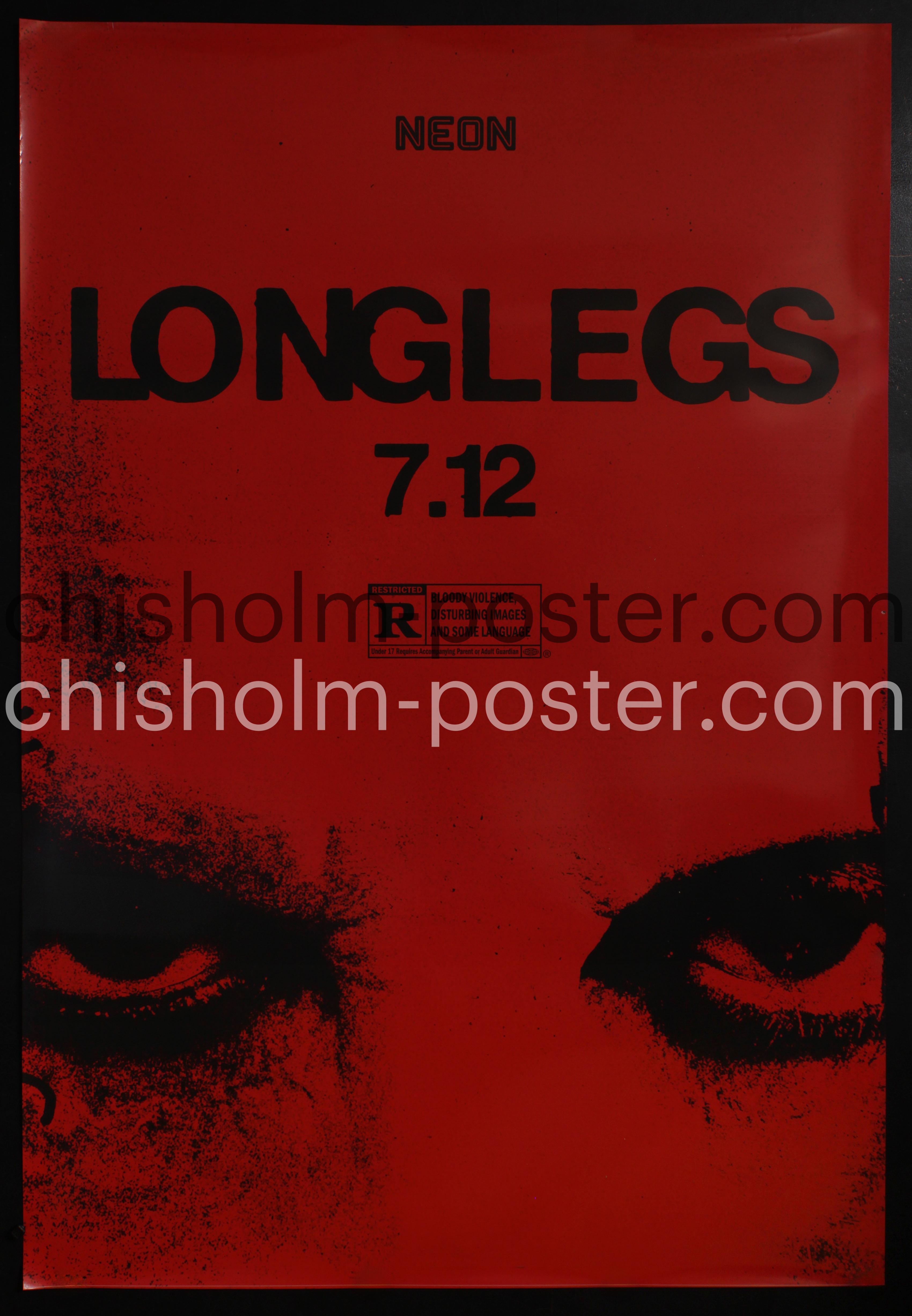 Large bus shelter poster. Longlegs is a 2024 American horror thriller film written and directed by Osgood Perkins and starring Maika Monroe, Blair Underwood, Alicia Witt, and Nicolas Cage. It follows an FBI agent in the 1990s who is tasked with tracking down an occultist serial killer responsible for murdering multiple families throughout Oregon. Cage served as a producer on the film through his Saturn Films production company. (Wikipedia)