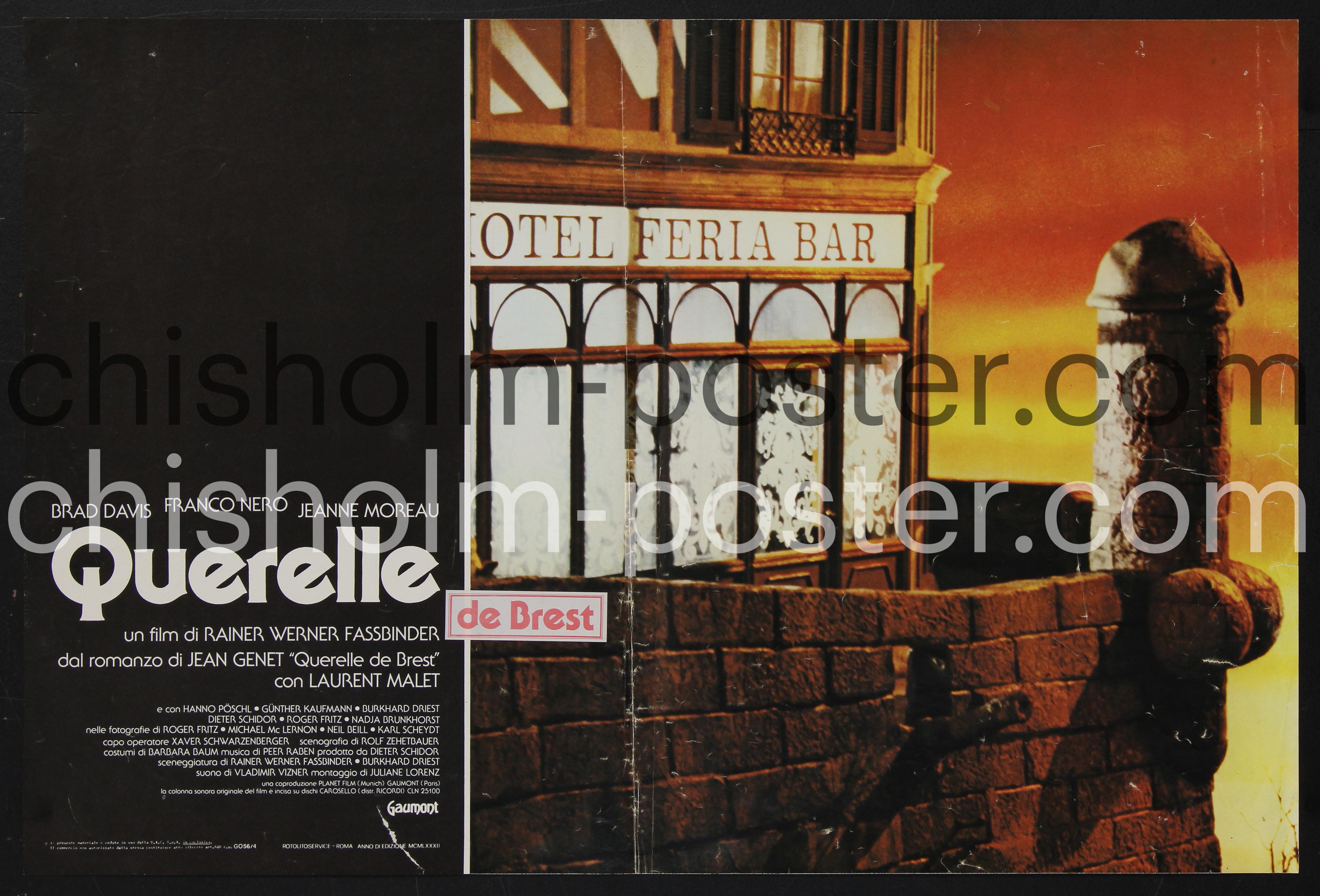 Italian release poster for Querelle (known in Italy as Querelle de Brest and sometimes Querelle), "a 1982 English-language erotic art film directed by Rainer Werner Fassbinder. The film stars Brad Davis and was adapted from French author Jean Genet's 1947 novel Querelle of Brest. The plot centers on the Belgian sailor Georges Querelle, who is both a thief and murderer. It was Fassbinder's last film, released shortly after his death at the age of 37." (Wikipedia)