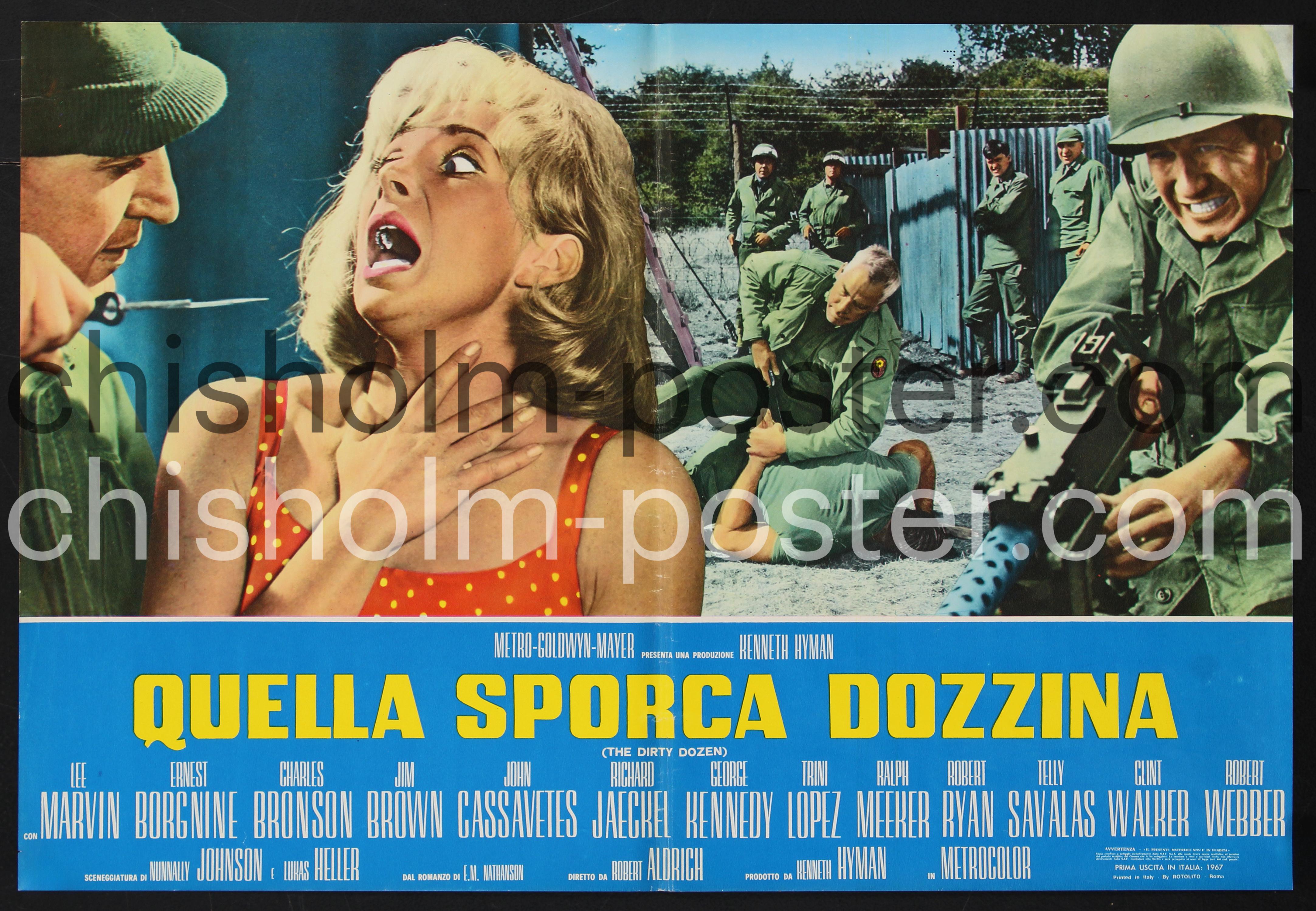 Italian release poster. "The Dirty Dozen is a 1967 war film directed by Robert Aldrich and starring Lee Marvin, with an ensemble supporting cast including Ernest Borgnine, Charles Bronson, Jim Brown, John Cassavetes, Richard Jaeckel, George Kennedy, Trini Lopez, Ralph Meeker, Robert Ryan, Telly Savalas, Clint Walker and Robert Webber. Set in 1944 during World War II, the film follows a penal military unit of twelve convicts as they are trained as commandos by the Allies for a suicide mission ahead of the Normandy landings. The screenplay is based on the 1965 bestseller by E. M. Nathanson, which in turn was inspired by a real-life World War II unit of behind-the-lines demolition specialists from the 101st Airborne Division named the "Filthy Thirteen". Filming took place at the MGM British Studios." (Wikipedia)