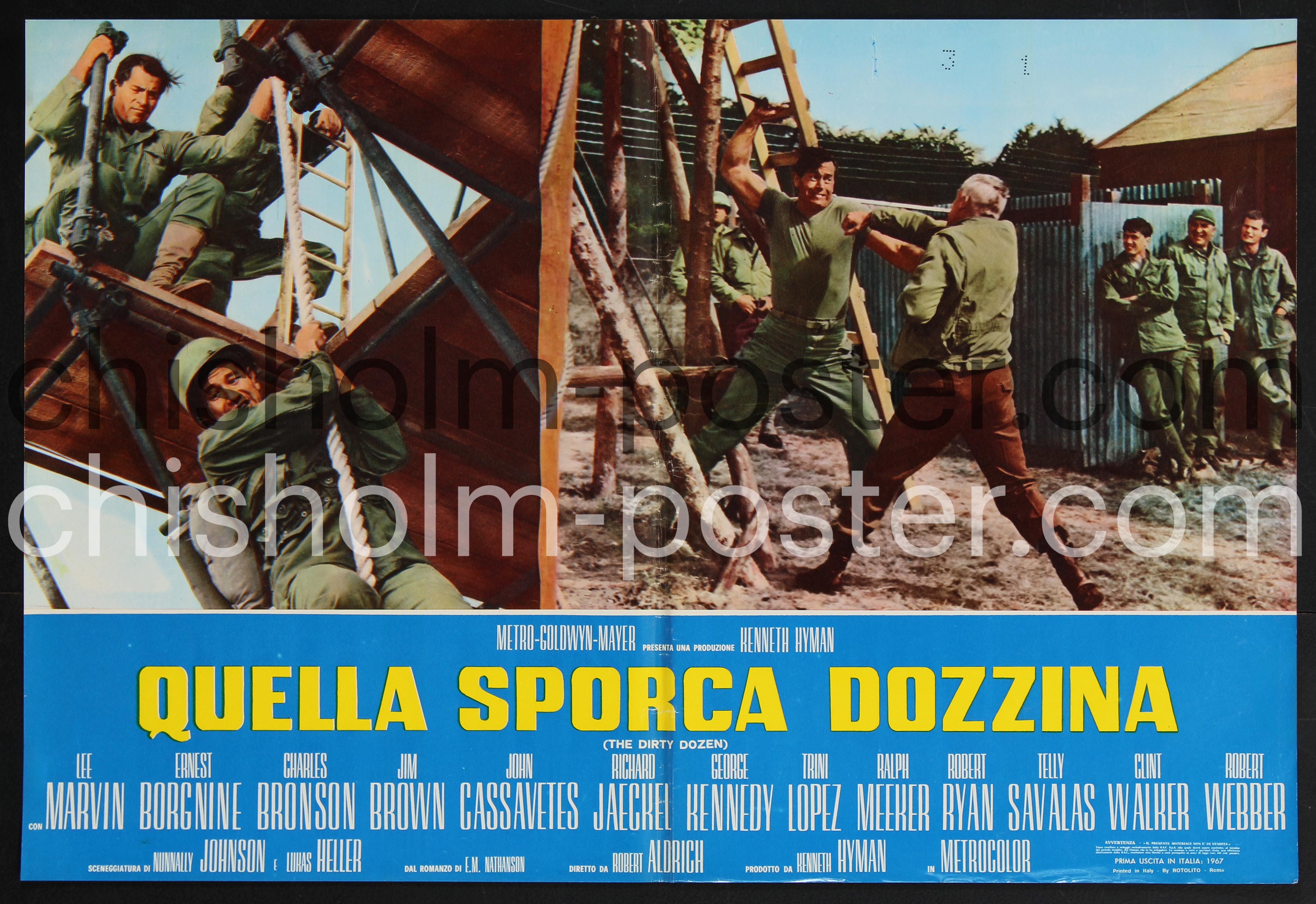Italian release poster. "The Dirty Dozen is a 1967 war film directed by Robert Aldrich and starring Lee Marvin, with an ensemble supporting cast including Ernest Borgnine, Charles Bronson, Jim Brown, John Cassavetes, Richard Jaeckel, George Kennedy, Trini Lopez, Ralph Meeker, Robert Ryan, Telly Savalas, Clint Walker and Robert Webber. Set in 1944 during World War II, the film follows a penal military unit of twelve convicts as they are trained as commandos by the Allies for a suicide mission ahead of the Normandy landings. The screenplay is based on the 1965 bestseller by E. M. Nathanson, which in turn was inspired by a real-life World War II unit of behind-the-lines demolition specialists from the 101st Airborne Division named the "Filthy Thirteen". Filming took place at the MGM British Studios." (Wikipedia)