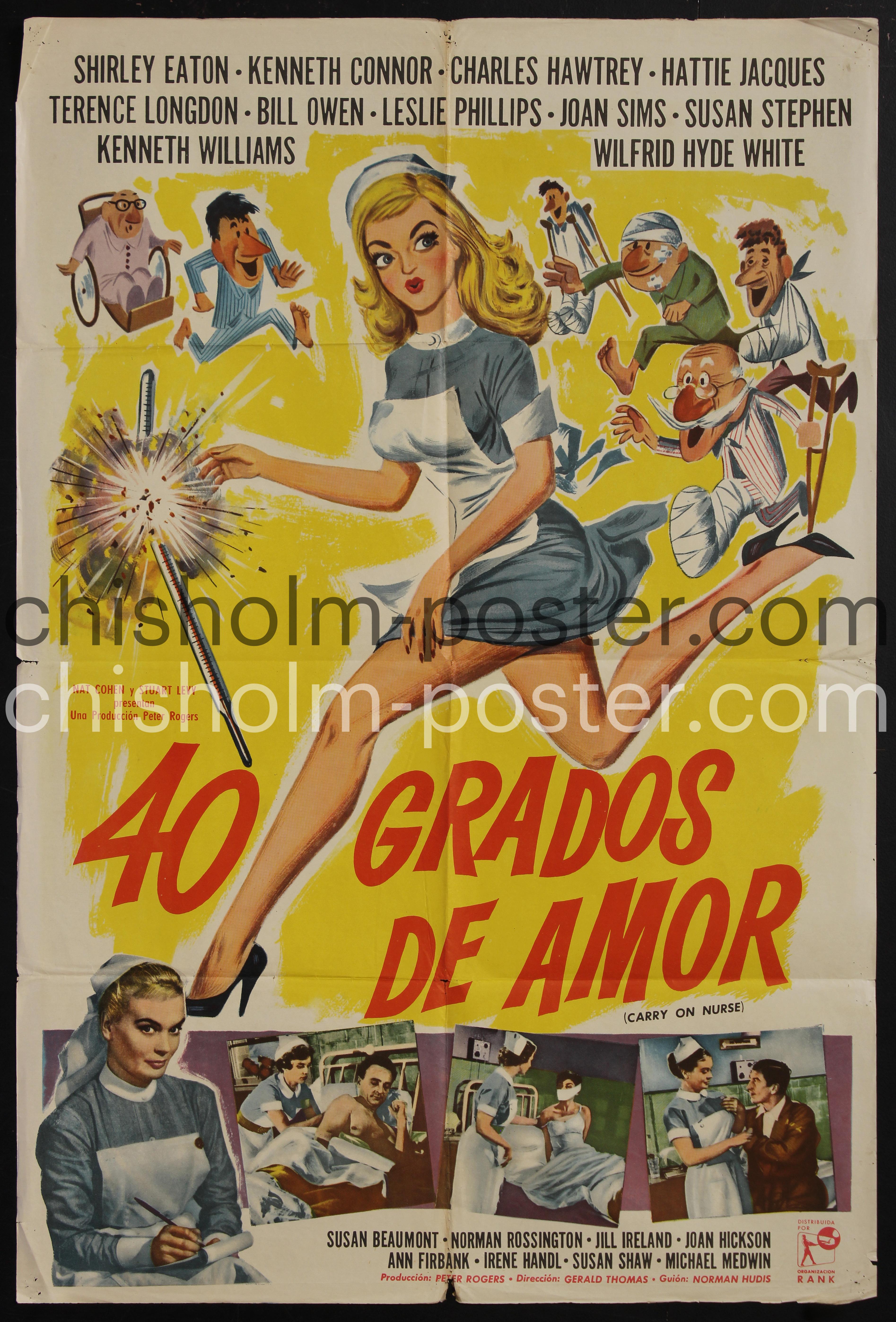 Argentinian release poster for a 1959 British film. Carry On Nurse is a 1959 British comedy film, the second in the series of 31 Carry On films (1958–1992). Of the regular team, it featured Joan Sims (in her Carry On film debut), Kenneth Williams, Kenneth Connor and Charles Hawtrey, with Hattie Jacques and Leslie Phillips. The film was written by Norman Hudis based on the play Ring for Catty by Patrick Cargill and Jack Beale. It was the top-grossing film of 1959 in the United Kingdom and, with an audience of 10.4 million, had the highest cinema viewing of any of the "Carry On" films. It was also highly successful in the United States, where it was reported that it played at some cinemas for three years. The film was followed by Carry On Teacher later in 1959." (Wikipedia)