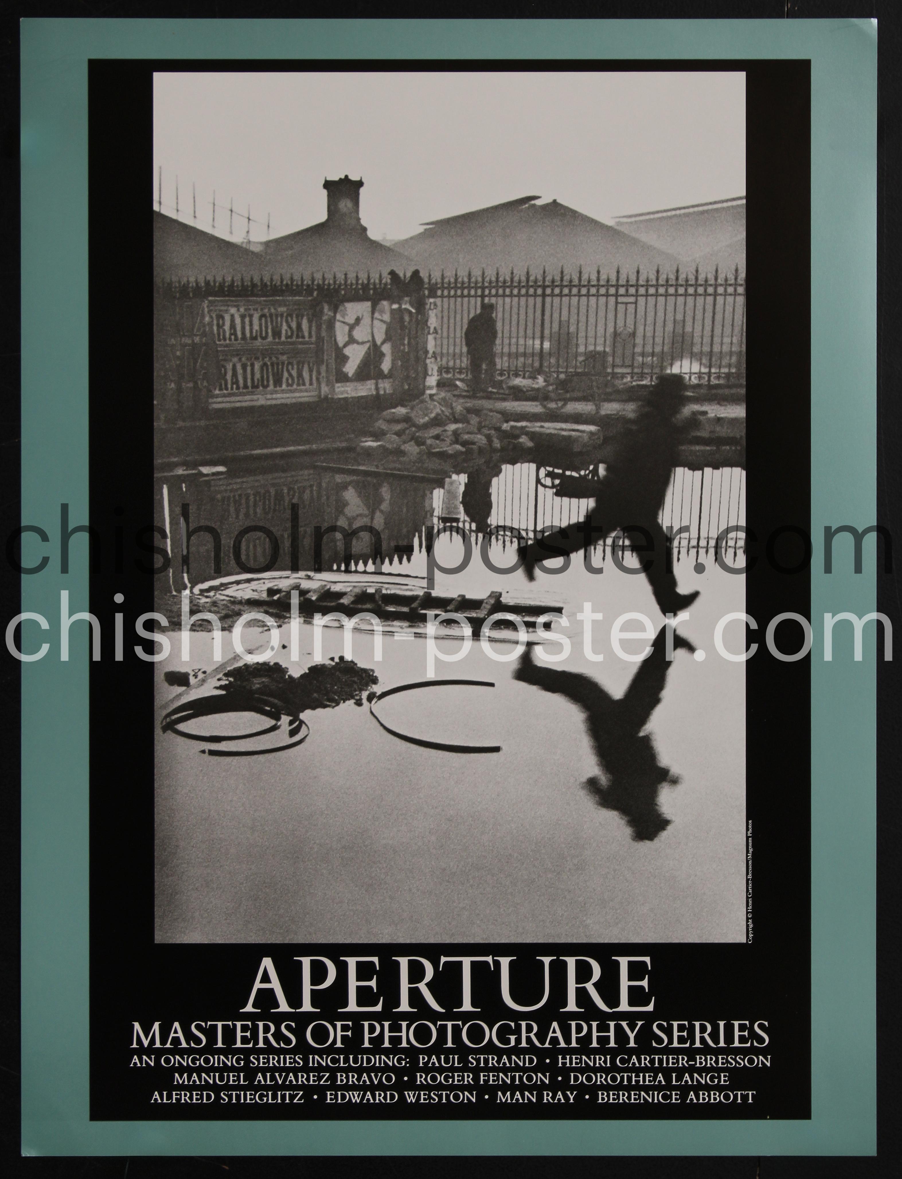 c.1980 Photography book poster for Aperture Masters of Photography Series. The series was first published from 1976 to late 1990s and later revived in 2014. Artwork featured is 'Man Jumping the Puddle/ Behind the Gare Saint-Lazare' taken by Henri Cartier-Bresson in 1932.