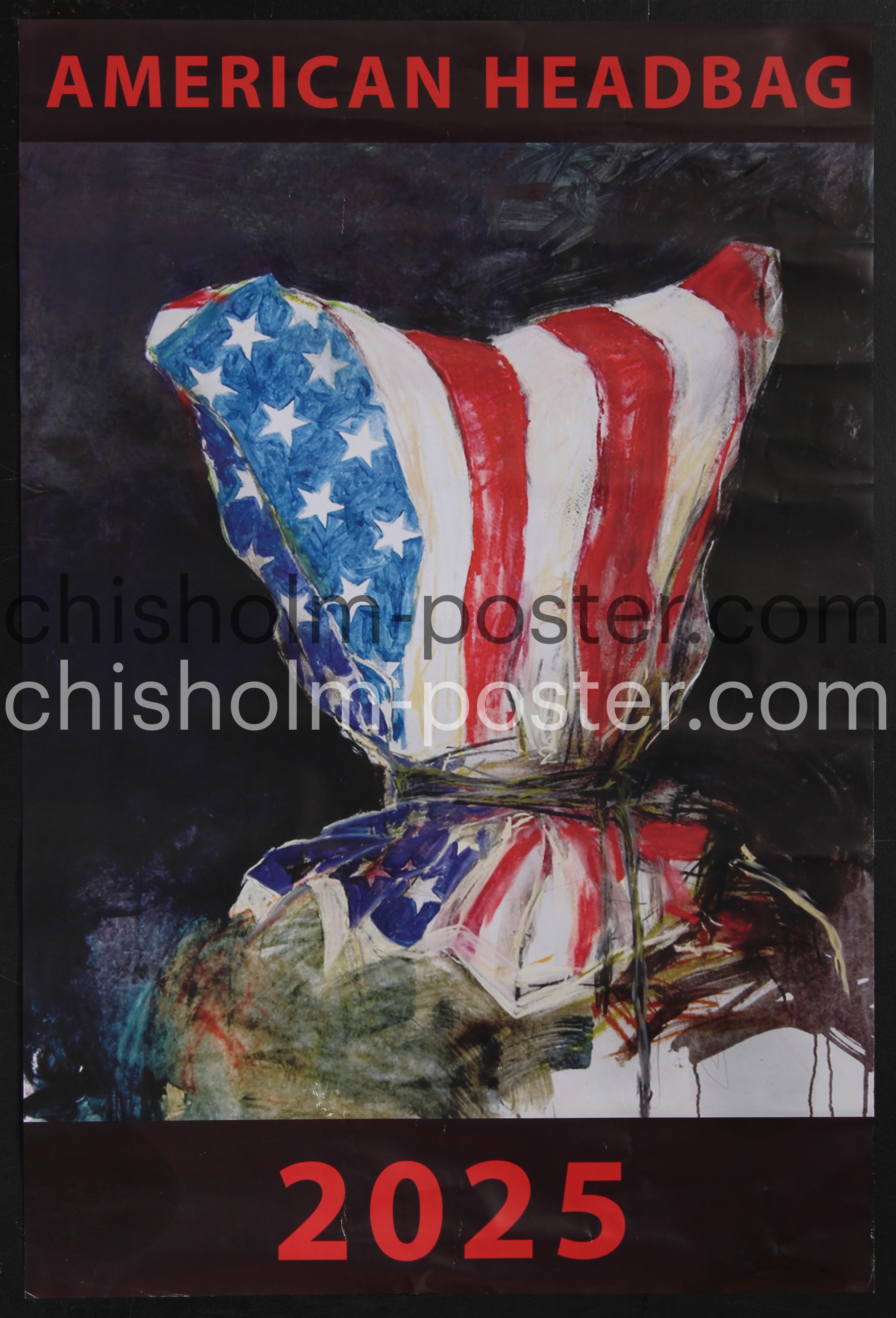 2025 Political protest poster. "A powerful direct statement of conscience by artist David Becker. A series of meditations on the American flag, originally created as an installation of twelve 60x48” works on paper, each slightly different and unique, each image becoming darker and ending as an image of darkened jail bars. Posters of the original artwork were installed throughout the streets of New York City as a campaign of passive resistance in October 2025." (americanheadbag.com)