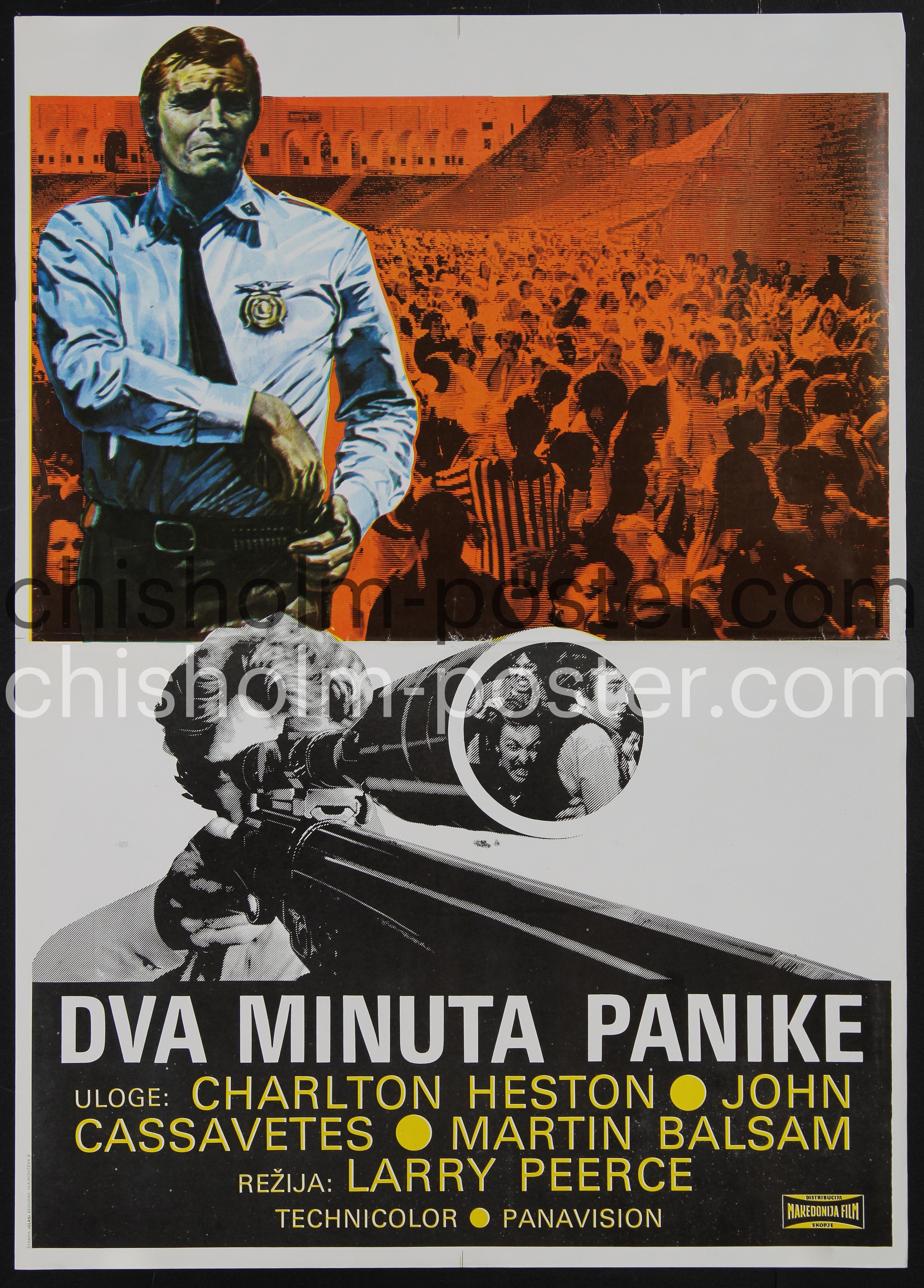 Yugoslavian release poster for the 1976 Larry Peerce football sports stadium mad killer sniper assassin crime thriller. "Two-Minute Warning is a 1976 action thriller film directed by Larry Peerce and starring Charlton Heston, John Cassavetes, Martin Balsam, Beau Bridges, Jack Klugman, Gena Rowlands, and David Janssen. It was based on the novel of the same name written by George LaFountaine " (Wikipedia)