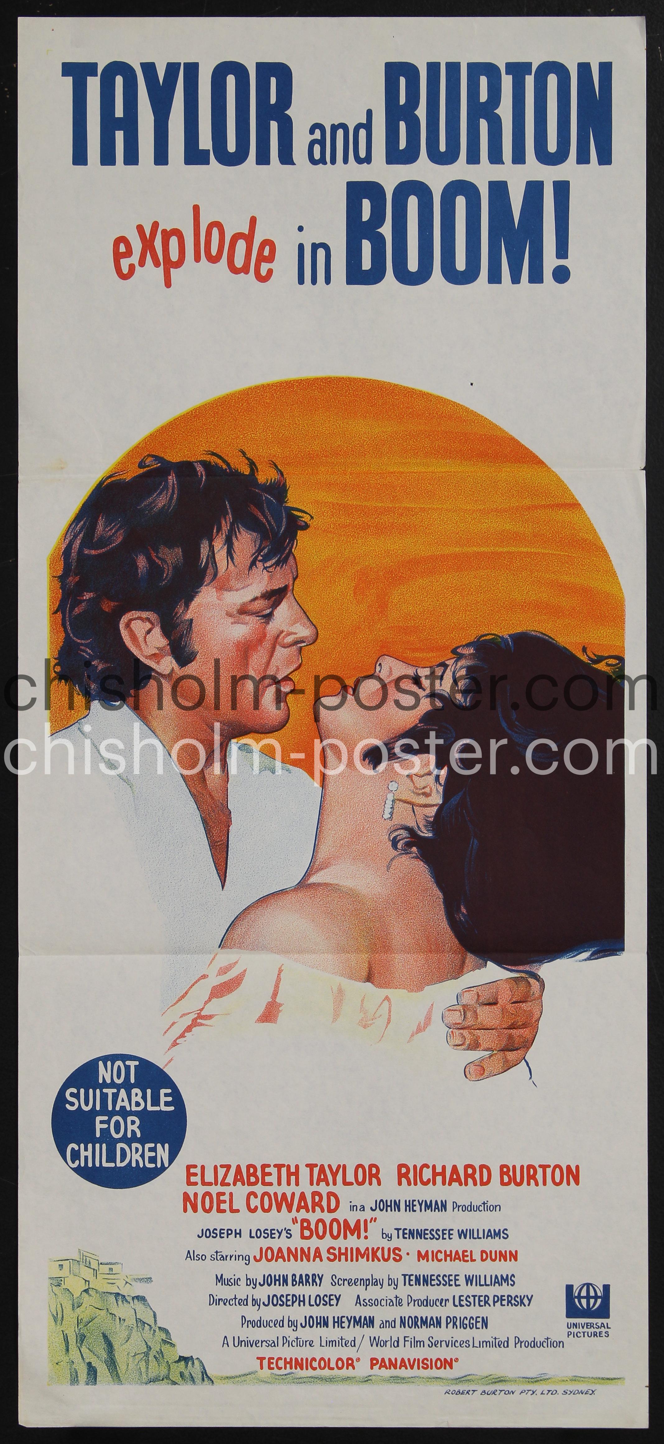 Boom! is a 1968 British drama film directed by Joseph Losey and starring Elizabeth Taylor, Richard Burton and Noël Coward. It was adapted by Tennessee Williams from his own play The Milk Train Doesn't Stop Here Anymore. (Wikipedia)