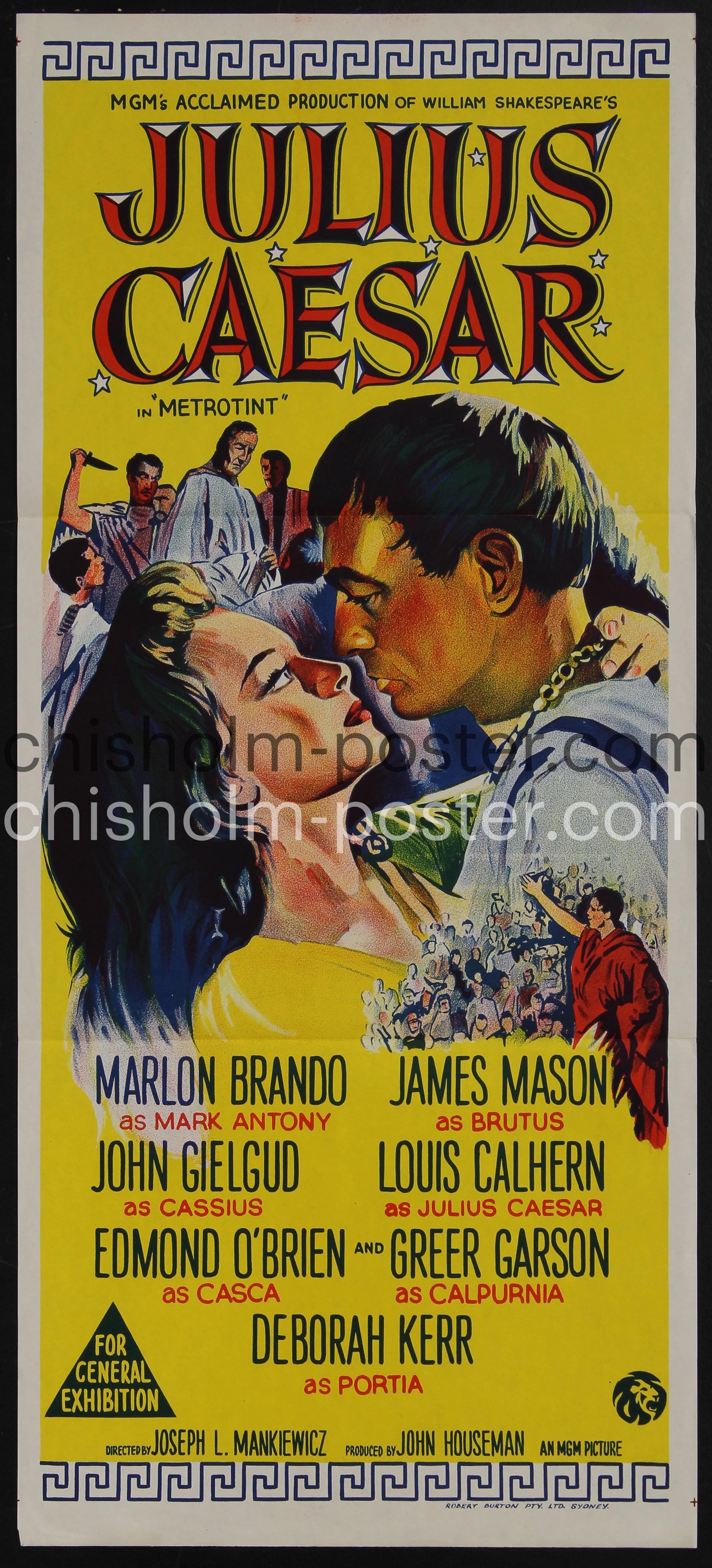 Julius Caesar (billed on-screen as William Shakespeare's Julius Caesar) is a 1953 American film adaptation of William Shakespeare's play Julius Caesar, directed by Joseph L. Mankiewicz and produced by John Houseman for Metro-Goldwyn-Mayer. It stars Marlon Brando as Mark Antony, James Mason as Brutus, John Gielgud as Cassius, Louis Calhern as Julius Caesar, Edmond O'Brien as Casca, Greer Garson as Calpurnia, and Deborah Kerr as Portia. It opened to positive reviews, and was nominated in five categories at the 26th Academy Awards (including Best Picture and Best Actor for Brando), winning Best Art Direction – Black-and-White. Brando and Gielgud both won BAFTA Awards, Brando for Best Foreign Actor and Gielgud for Best British Actor. (Wikipedia)
