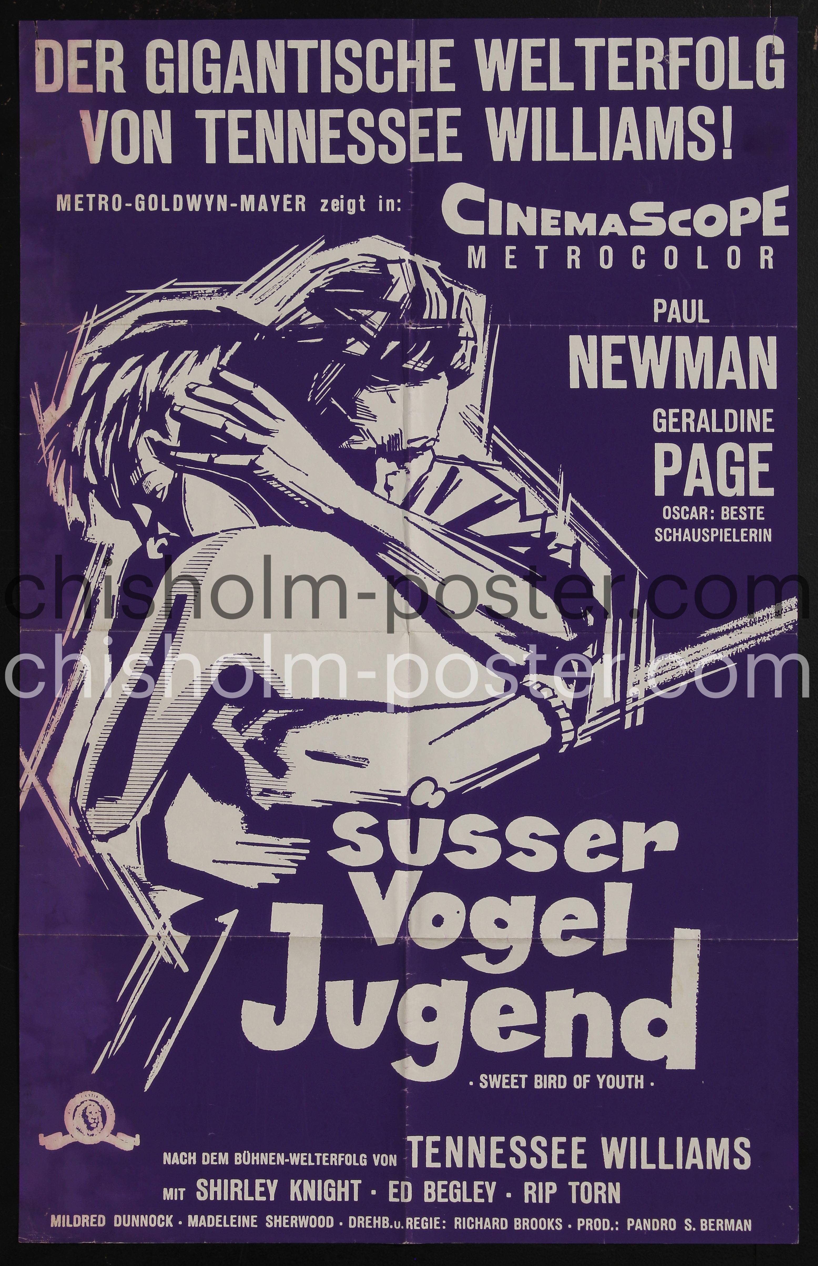 Sweet Bird of Youth is a 1962 American drama film starring Paul Newman and Geraldine Page, with Shirley Knight, Madeleine Sherwood, Ed Begley, Rip Torn and Mildred Dunnock in support. Based on the 1959 play of the same name by Tennessee Williams, the film was adapted and directed by Richard Brooks. The film won the Academy Award for Best Supporting Actor (Ed Begley), and was nominated for Best Actress (Geraldine Page) and Best Supporting Actress (Shirley Knight). The film version was sanitized, although Chance Wayne was still gigolo for hire. The ending was heavily altered from the explicit sexual mutilation scene depicted in the conclusion of the original stage version. (Wikipedia)