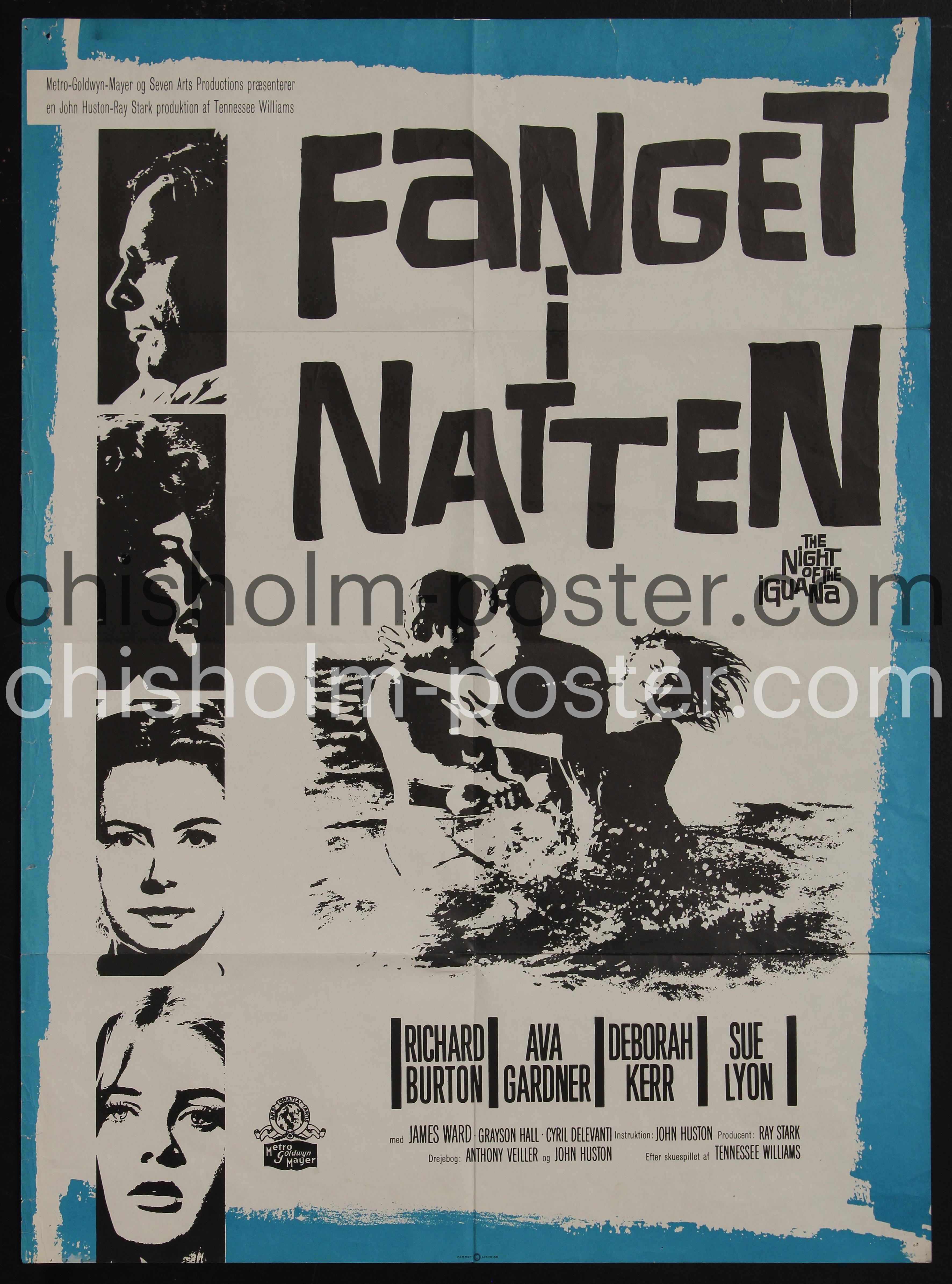 Danish release poster for "The Night of the Iguana" a 1964 American drama film directed by John Huston, written for the screen by Huston and Anthony Veiller, and based on the 1961 play of the same name by Tennessee Williams. It stars Richard Burton, Ava Gardner, Deborah Kerr, Grayson Hall, Sue Lyon, and Cyril Delevanti. (Wikipedia)