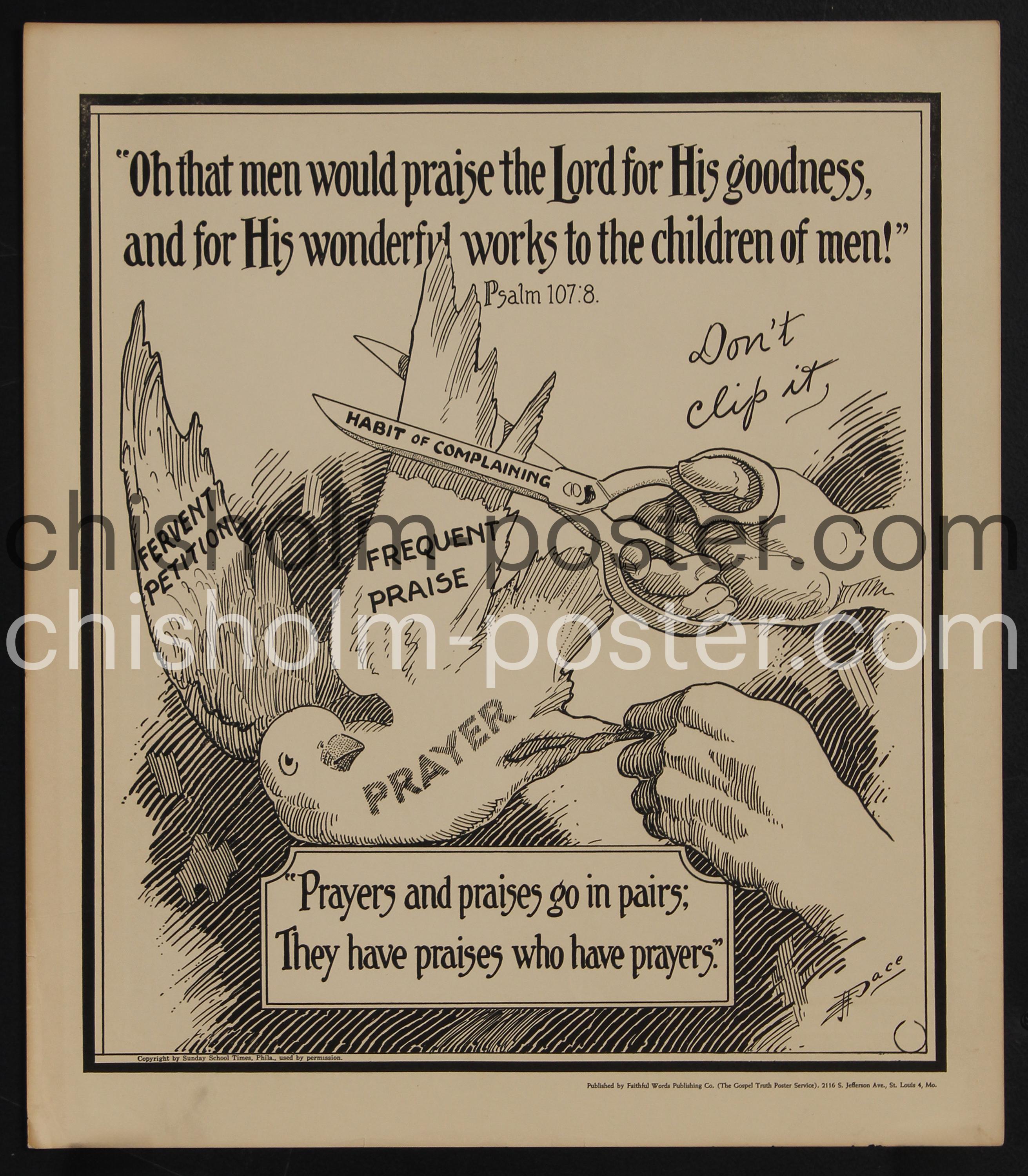 Published by Faithful Words Publishing Co. (The Gospel Truth Poster Service), Copyright by Sunday School Times, Phila. Religious illustration featuring Bible verses and a metaphor about prayer. The text highlights the importance of combining prayer with gratitude featuring Psalm 107:8: “Oh that men would praise the Lord for His goodness, and for His wonderful works to the children of men!” Ernest James Pace (1880–1946) was a pioneering Christian cartoonist known for his influential illustrations in The Sunday School Times and other fundamentalist publications between 1916 and 1946.