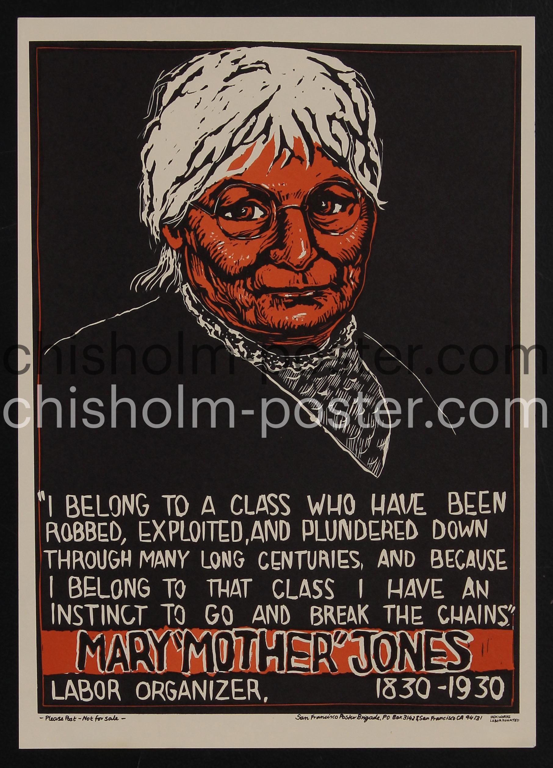 c.1979 Poster with a portrait of Mary G. Harris Jones (baptized August 1, 1837 – November 30, 1930), "known as Mother Jones from 1897 onward, was an Irish-American labor organizer, schoolteacher, and dressmaker who became a prominent union organizer, community organizer, and activist. She helped coordinate major strikes, secure bans on child labor, and co-founded the trade union Industrial Workers of the World" (Wikipedia). Quote by her reads: "I belong to a class who have been robbed, exploited, and plundered down through many long centuries, and because I belong to that class I have an instinct to go and break the chains." "The San Francisco Poster Brigade, originally called the Wilfred Owen Brigade, was co-founded by artist Rachael Romero in the San Francisco Bay area in 1975. In 1980 they began the Internationalist Art Show: Anti WW3, a mail-art phenomenon in San Francisco. The show became a festival of art, poetry, dance and performance, travelling to Los Angeles, Tucson, New York City and back to San Francisco until 1982." (George Mason University Libraries)
