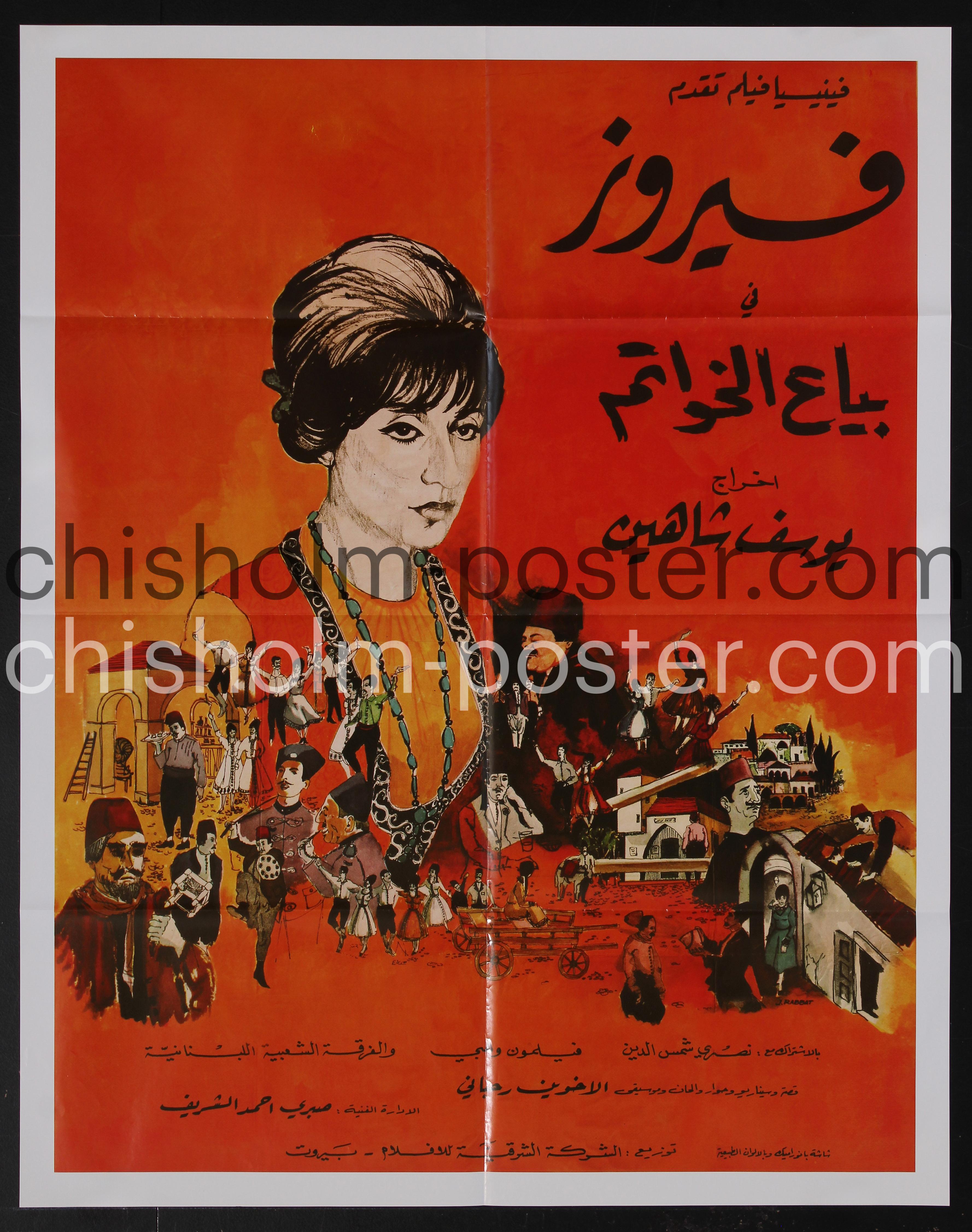 Poster with Arabic text (probably for an later Lebanese re-release) for the 1965 Lebanese musical comedy depicting the iconic Lebanese singer and actress, Fairuz, who is "Probably the greatest Arabic singer of modern times. Fairuz (neé Nuhad Haddad; born 1933), also known as Fayrouz, led the creation of a new musical language in the Middle East. ..." (Wikipedia). Acquired with a collection of Egyptian movie posters.