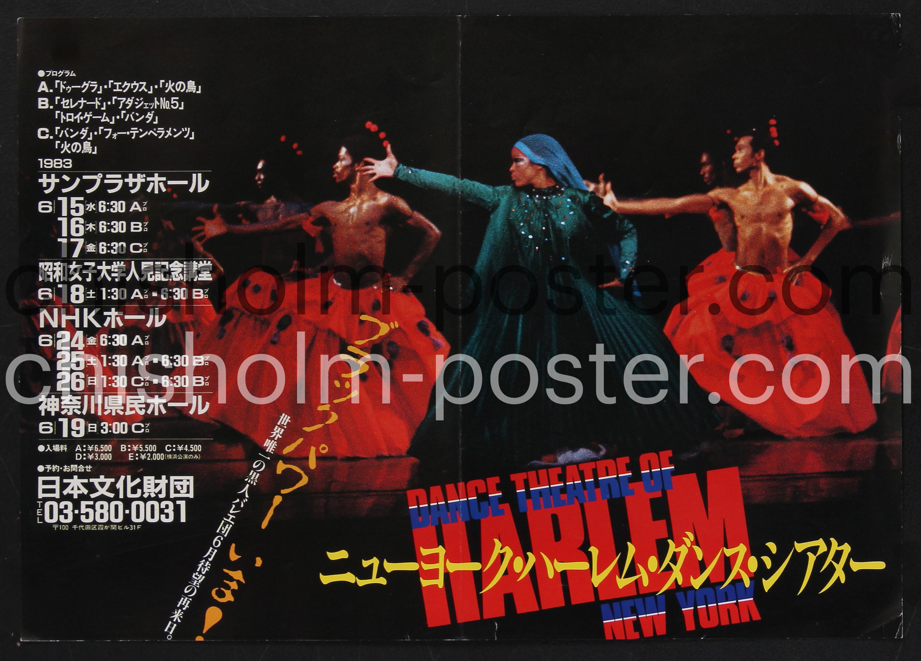 Striking Japanese flyer promoting a 1983 tour of the Dance Theatre of Harlem. This image shows a scene from the ballet "Dougla," choreographed by Geoffrey Holder and performed by the Dance Theatre of Harlem (possibly with Virginia Johnson). The company performed at several venues in Japan, including Sun Plaza Hall, Showa Women's University Hitomi Memorial Hall, NHK Hall, and Kanagawa Kenmin Hall. The program featured performances of "Dougla," "Equus," "Firebird," "Serenade," "Adagietto No. 5," "Troy Game," "Banda," and "The Four Temperaments."