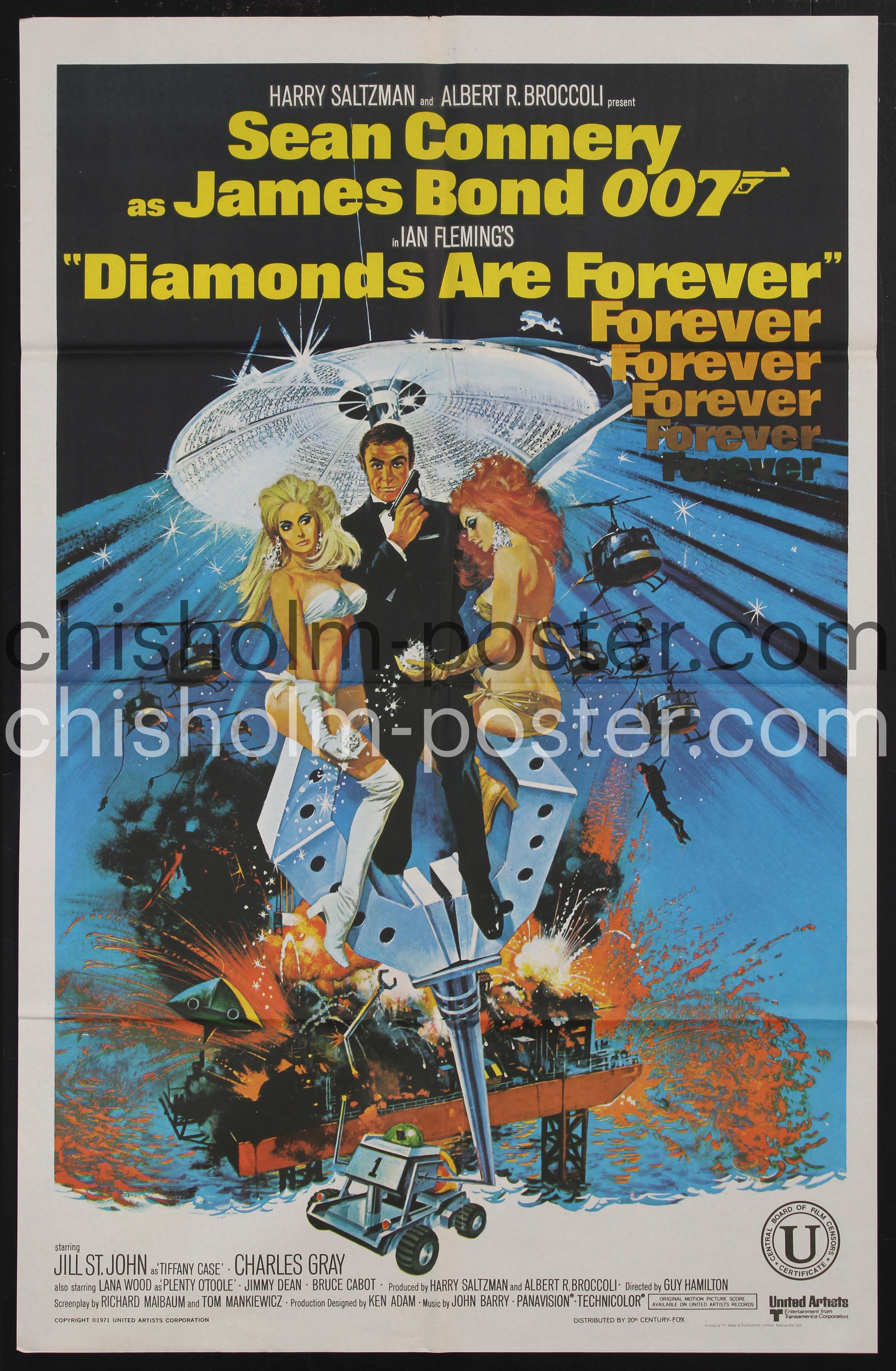 Indian release poster for for Diamonds Are Forever, "a 1971 spy film and the seventh film in the James Bond series produced by Eon Productions. It is the sixth and final Eon film to star Sean Connery, who returned to the role as the fictional MI6 agent James Bond." (Wikipedia) Printed at TT Maps & Publications Limited, Madras.