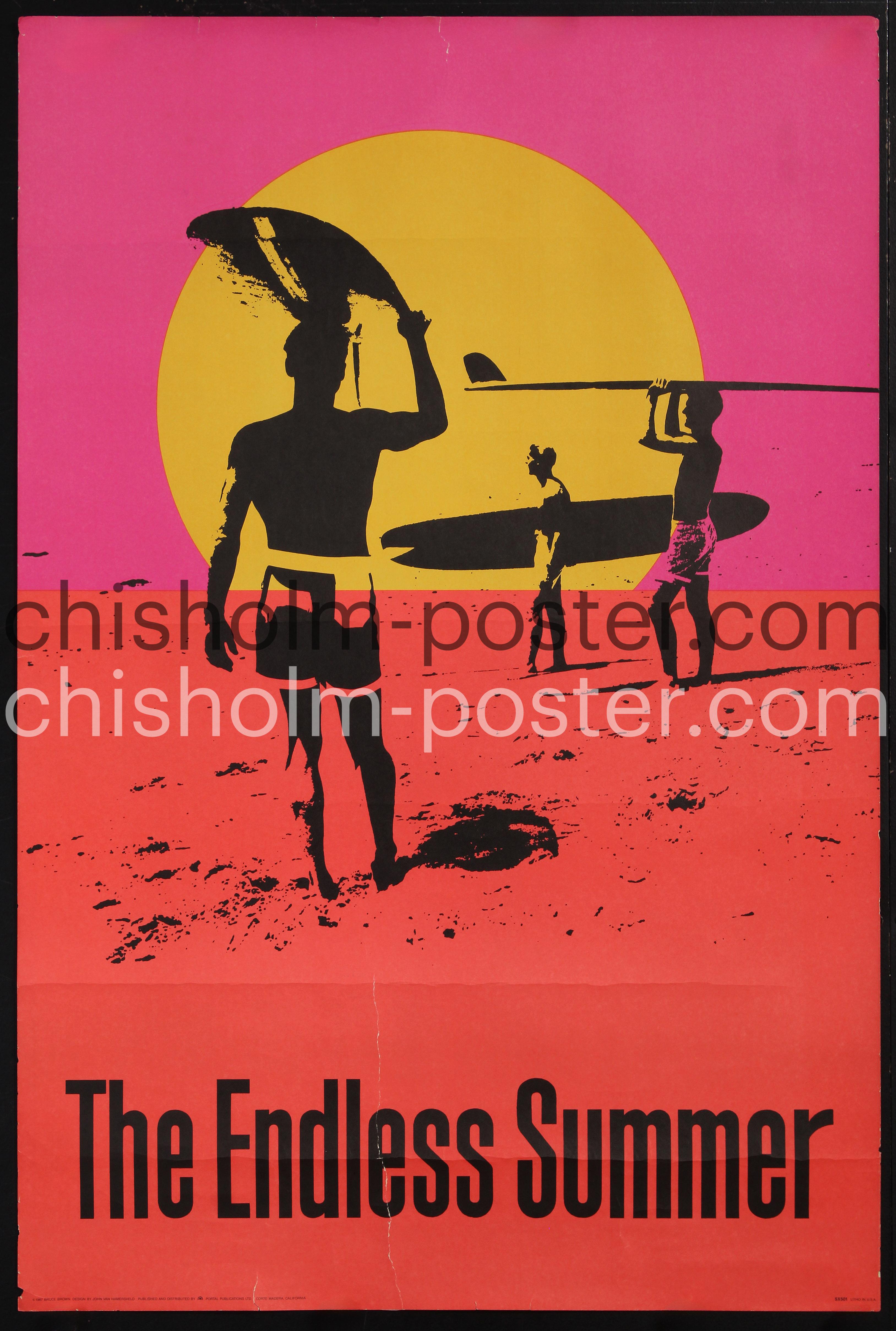 1987 Portal Publications Commercial pinup for the famed surfing documentary. "The Endless Summer is a 1966 American surf documentary film directed, produced, edited and narrated by Bruce Brown. The film follows surfers Mike Hynson and Robert August on a surfing trip around the world. Despite the balmy mediterranean climate of their native California, cold ocean currents make local beaches inhospitable during the winter, without later, modern wetsuits. They travel to the coasts of Australia, New Zealand, Tahiti, Hawaii, Senegal (Dakar), Ghana, Nigeria and South Africa in a quest for new surf spots while introducing locals to the sport along the way." (Wikipedia)