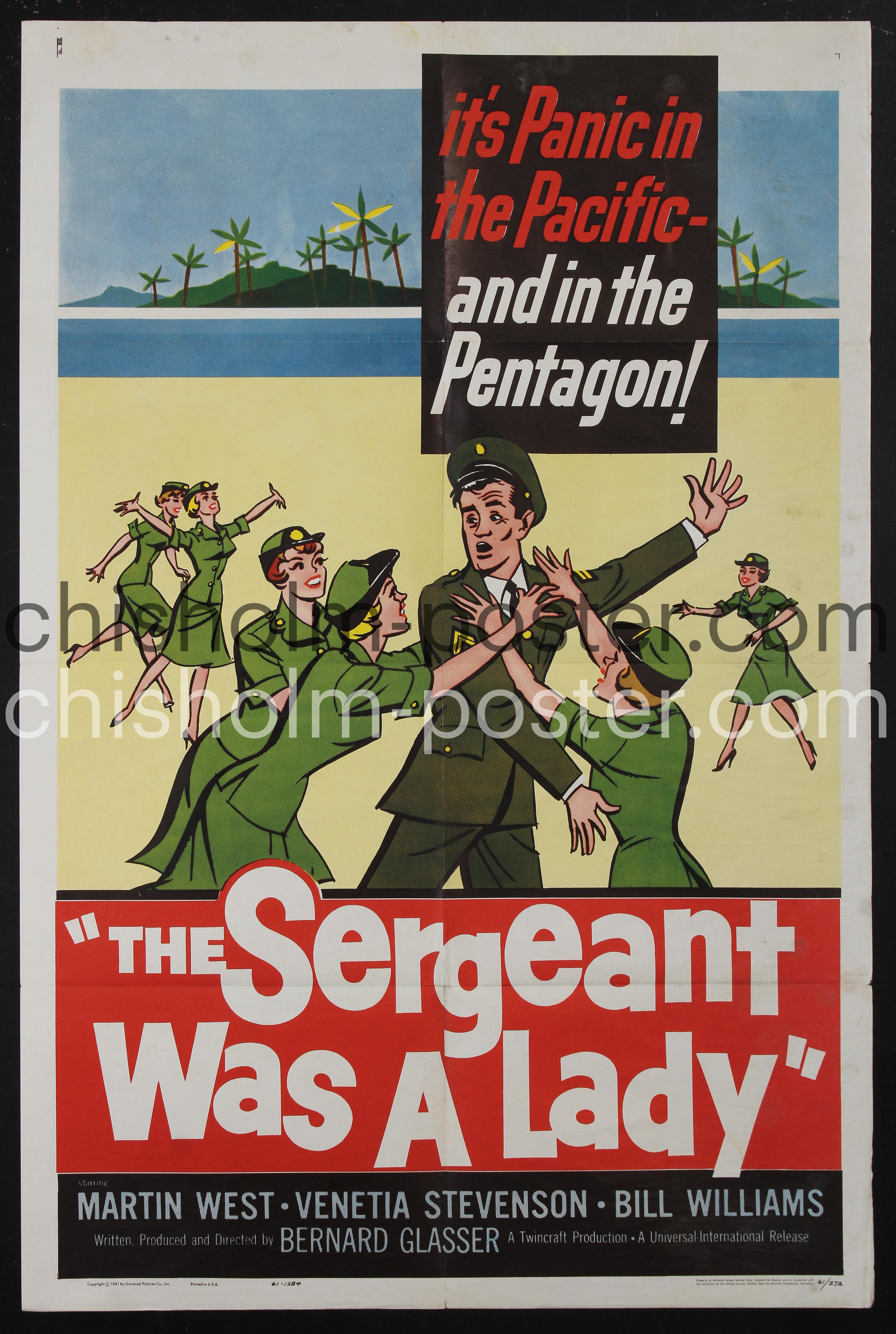 1961 World War II (WWII) era military romantic comedy. The Sergeant Was a Lady is a 1961 American comedy film written and directed by Bernard Glasser. The film stars Martin West, Venetia Stevenson, Bill Williams, Catherine McLeod, Roy Engel, and Gregg Martell. The film was released on October 4, 1961, by Universal Pictures. (Wikipedia)