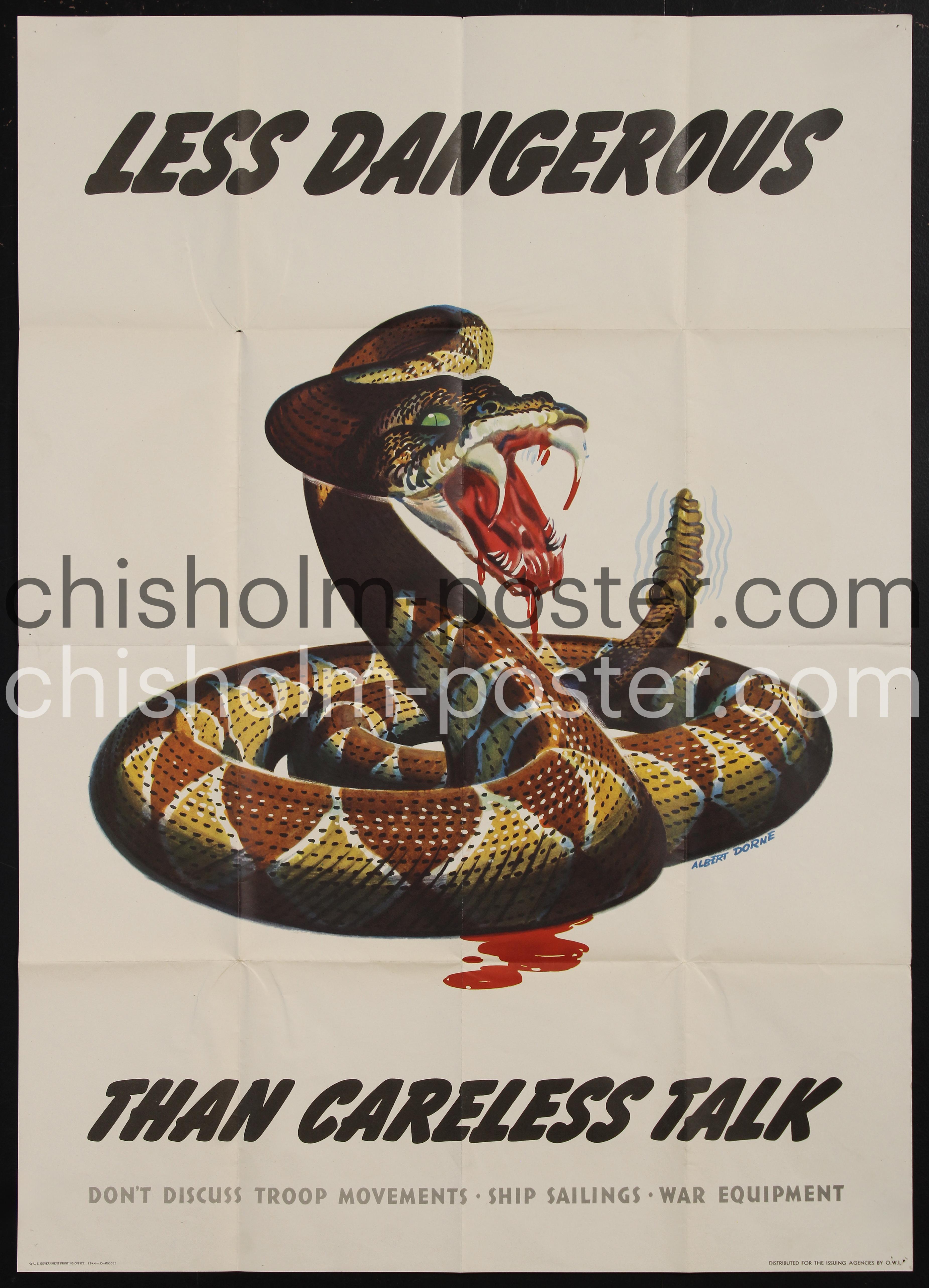 "Don't Discuss Troop Movements..." 1944 World War II U.S. government propaganda poster designed by Albert Dorne. It features a venomous rattlesnake ready to strike, arguing that careless conversations regarding troop movements, ship sailings, and war equipment are more dangerous than the snake itself. The campaign aimed to prevent spying and maintain operational security.