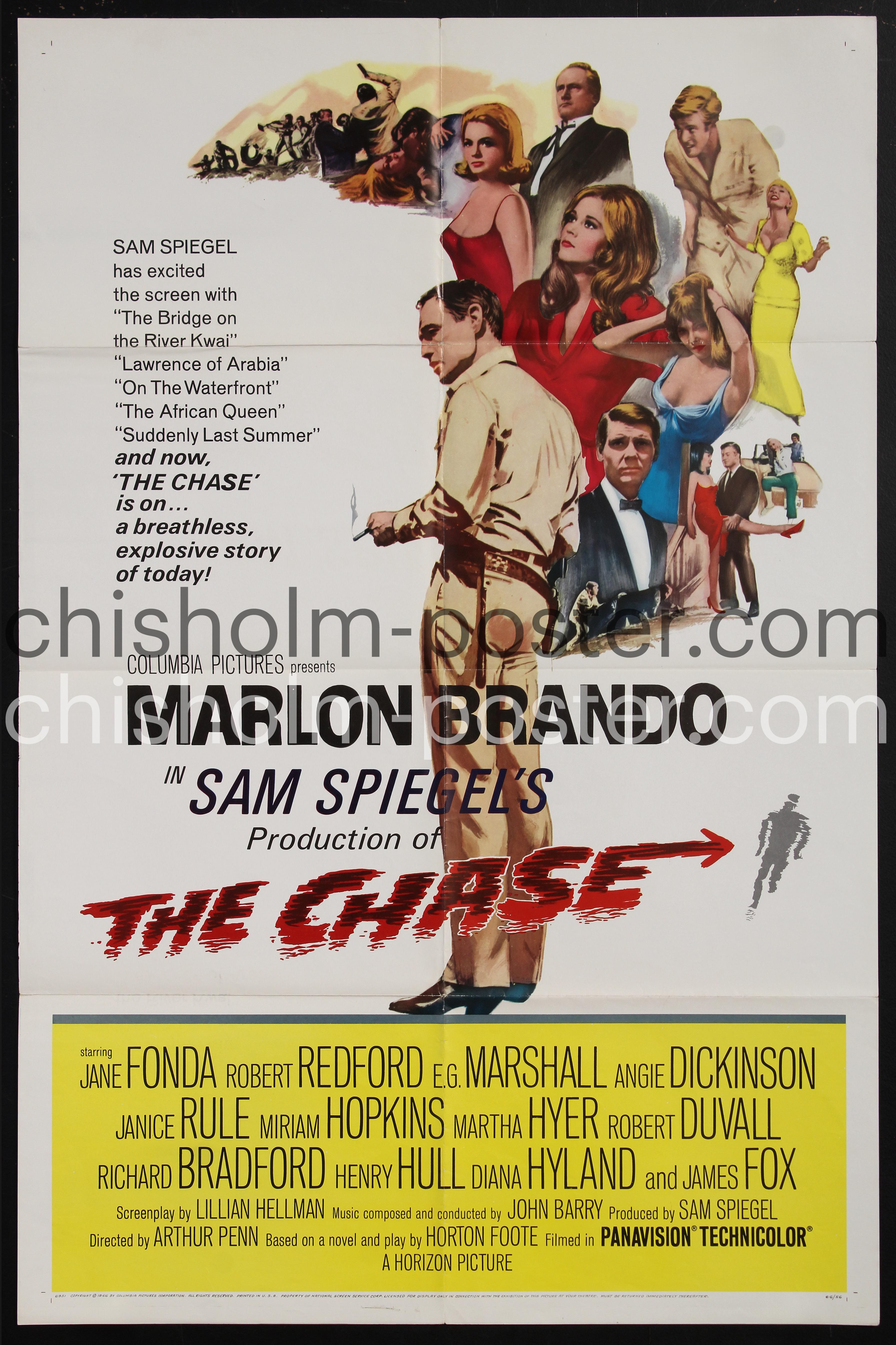 The Chase is a 1966 American drama film, directed by Arthur Penn, written by Lillian Hellman, and starring Marlon Brando, Jane Fonda, and Robert Redford. It tells the story of a series of events that are set into motion by a prison break. The film also features E. G. Marshall, Angie Dickinson, Janice Rule, Miriam Hopkins, Martha Hyer, Robert Duvall, and James Fox.