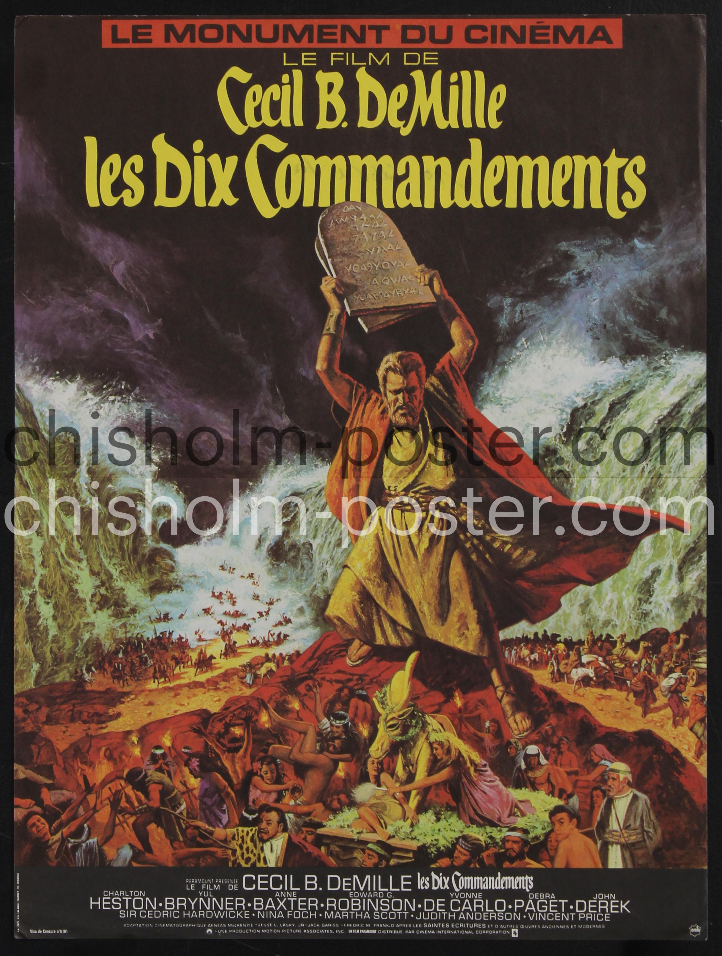 1970s re-release French "petite" size poster for The Ten Commandments, "a 1956 American epic biblical adventure drama film produced, directed, and narrated by Cecil B. DeMille, shot in VistaVision (color by Technicolor), and released by Paramount Pictures. Based on the Bible's Book of Exodus and other sources, it dramatizes the story of the life of Moses, an adopted Egyptian prince who becomes the deliverer of his real brethren, the enslaved Hebrews, and thereafter leads the Exodus to Mount Sinai, where he receives, from God, the Ten Commandments. The film stars Charlton Heston in the lead role, Yul Brynner as Rameses, Anne Baxter as Nefretiri, Edward G. Robinson as Dathan, Yvonne De Carlo as Sephora, Debra Paget as Lilia, and John Derek as Joshua; and features Sir Cedric Hardwicke as Sethi I,[b] Nina Foch as Bithiah, Martha Scott as Yochabel, Judith Anderson as Memnet, and Vincent Price as Baka, among others." (Wikipedia)