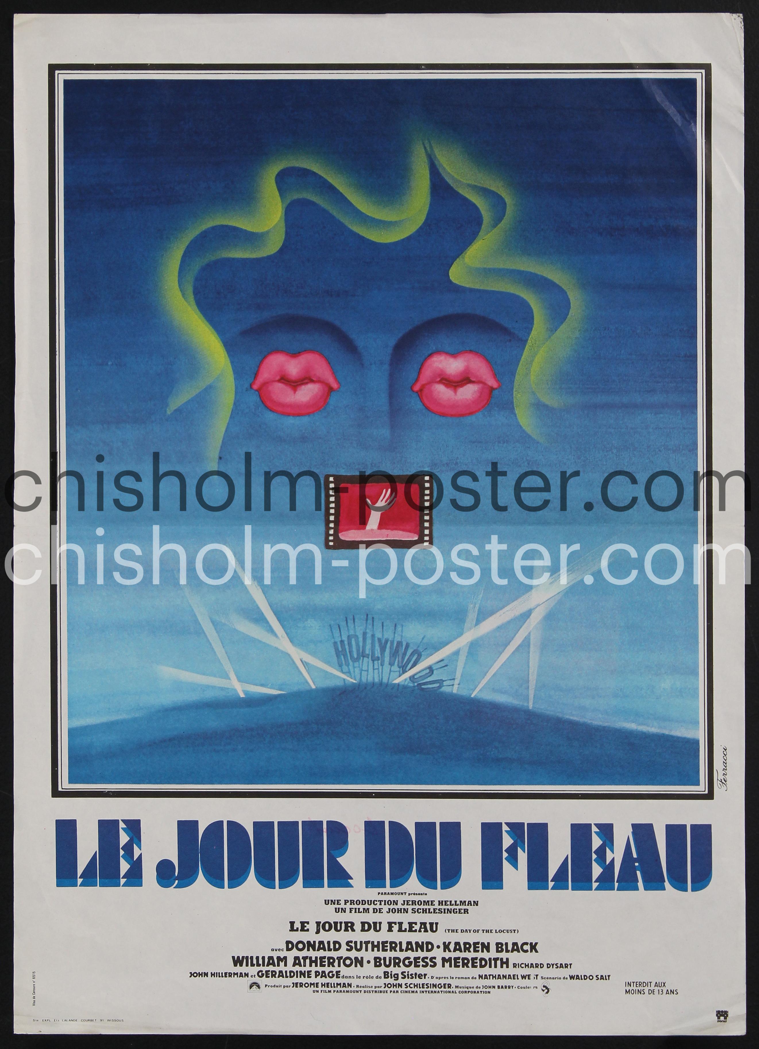 French release Petite movie poster. "The Day of the Locust is a 1975 American satirical historical drama film directed by John Schlesinger. It stars Donald Sutherland, Karen Black, William Atherton, Burgess Meredith, Richard Dysart, John Hillerman, and Geraldine Page. Set in Hollywood, California, just before World War II, the film conveys the alienation and desperation of a disparate group of people whose dreams of success do not come true. The screenplay by Waldo Salt is based on the 1939 novel of the same title by Nathanael West. The Day of the Locust garnered scholarly attention for its nightmarish depiction and acerbic commentary of the Hollywood film industry, and critical attention for its visually implicit horror elements." (Wikipedia)
