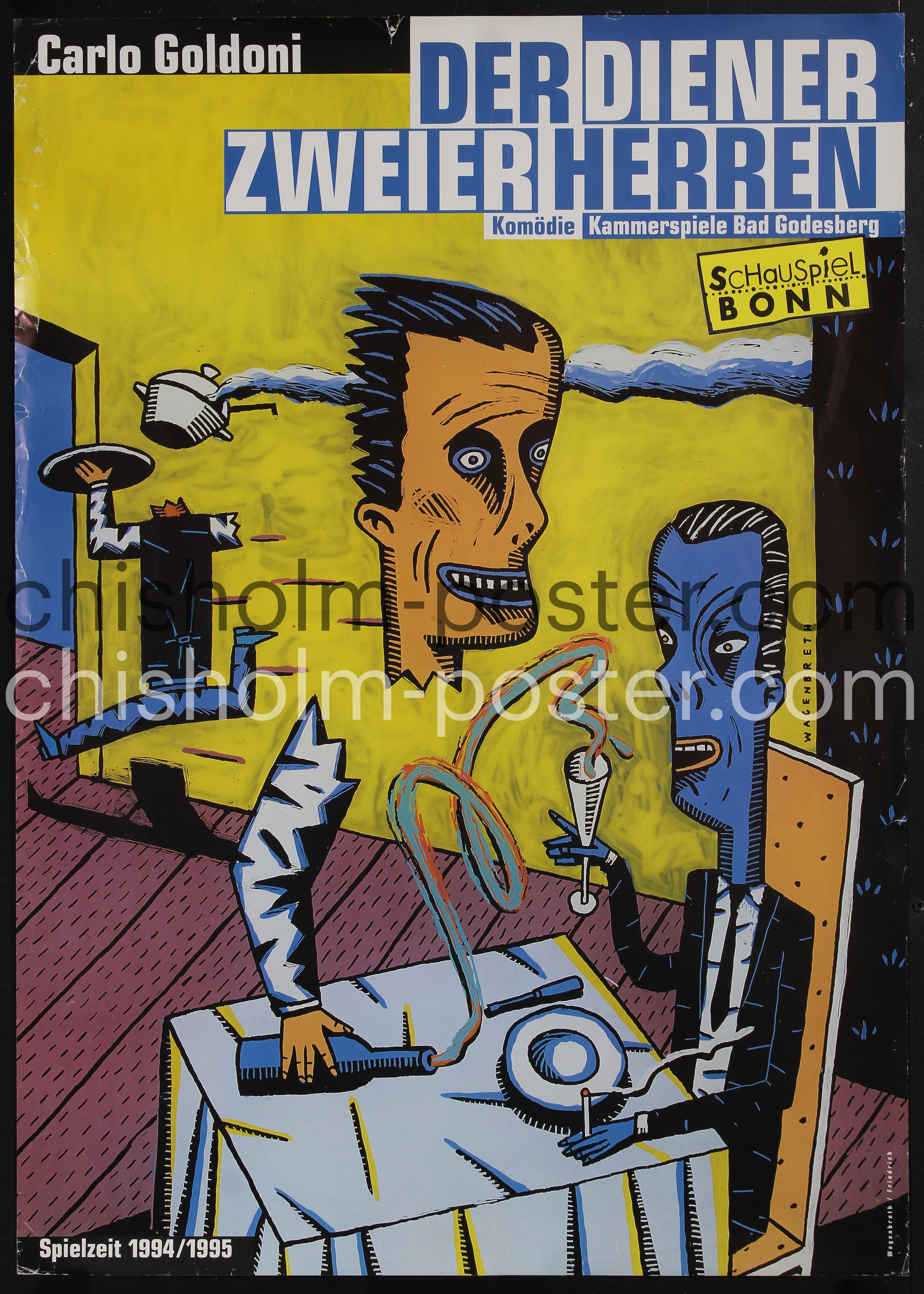 Poster from a production from the 1994 / 95 season of Schauspiel Bonn performed in Bonn, Germany. The Servant of Two Masters is a classic Italian commedia dell'arte play by Carlo Goldoni, first performed in 1746, about the chaotic schemes of the hungry servant Truffaldino, who tries to serve two masters at once for double the pay and meals, leading to a tangled web of mistaken identities, disguises, and romantic complications in Venice. Schauspiel Bonn is the drama division of Theater Bonn in Germany, featuring a permanent acting ensemble that produces a diverse repertoire of classical and modern plays.
