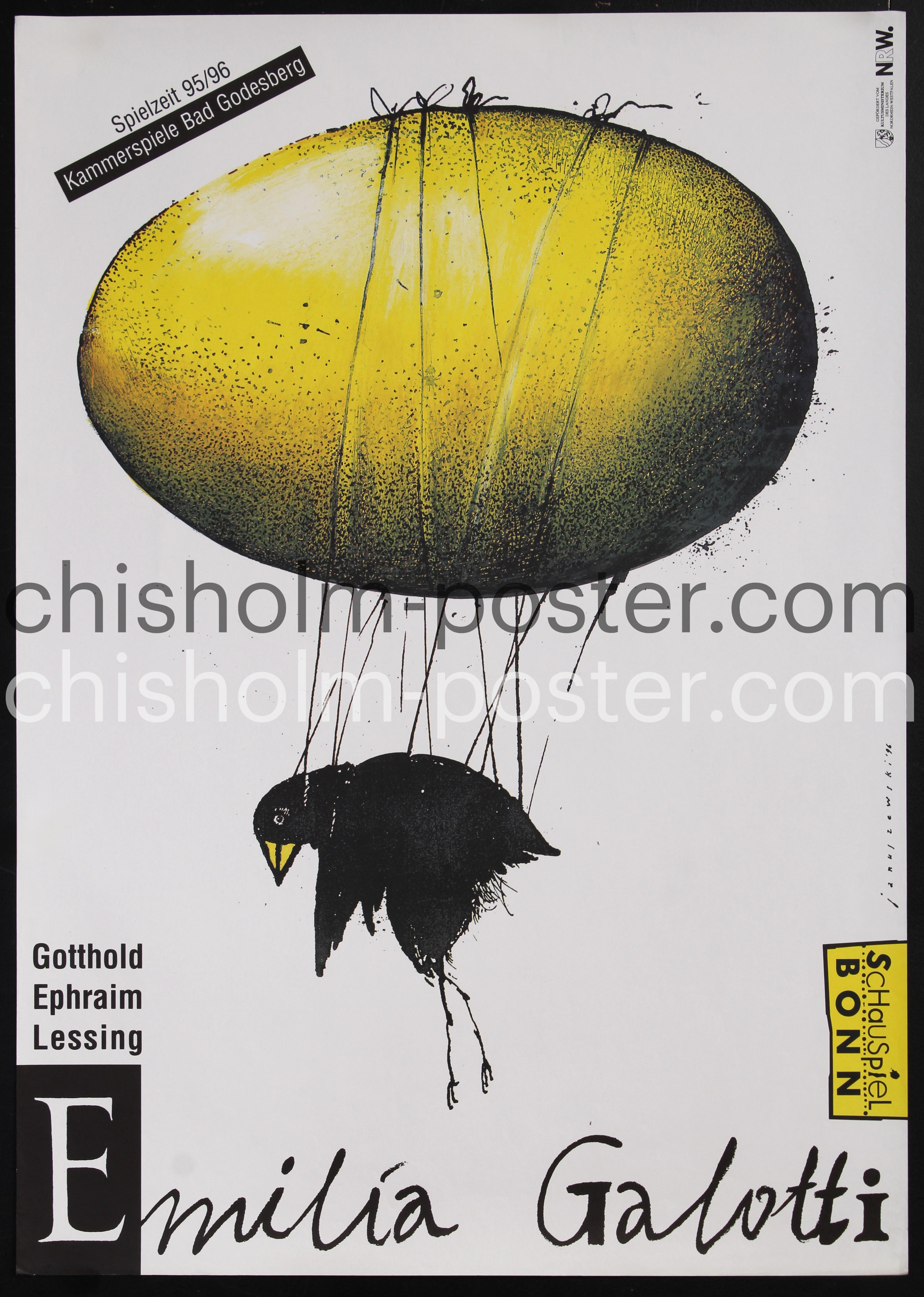 1996 Poster from a production from the 1995 / 96 season of Schauspiel Bonn performed in Bonn, Germany. Emilia Galotti is a 1772 German tragedy by Gotthold Ephraim Lessing, considered a key work of "bourgeois tragedy" and Enlightenment literature, criticizing aristocratic power through the story of a virtuous young woman, Emilia, whose planned marriage is thwarted by a prince, leading to a tragic end. Schauspiel Bonn is the drama division of Theater Bonn in Germany, featuring a permanent acting ensemble that produces a diverse repertoire of classical and modern plays.