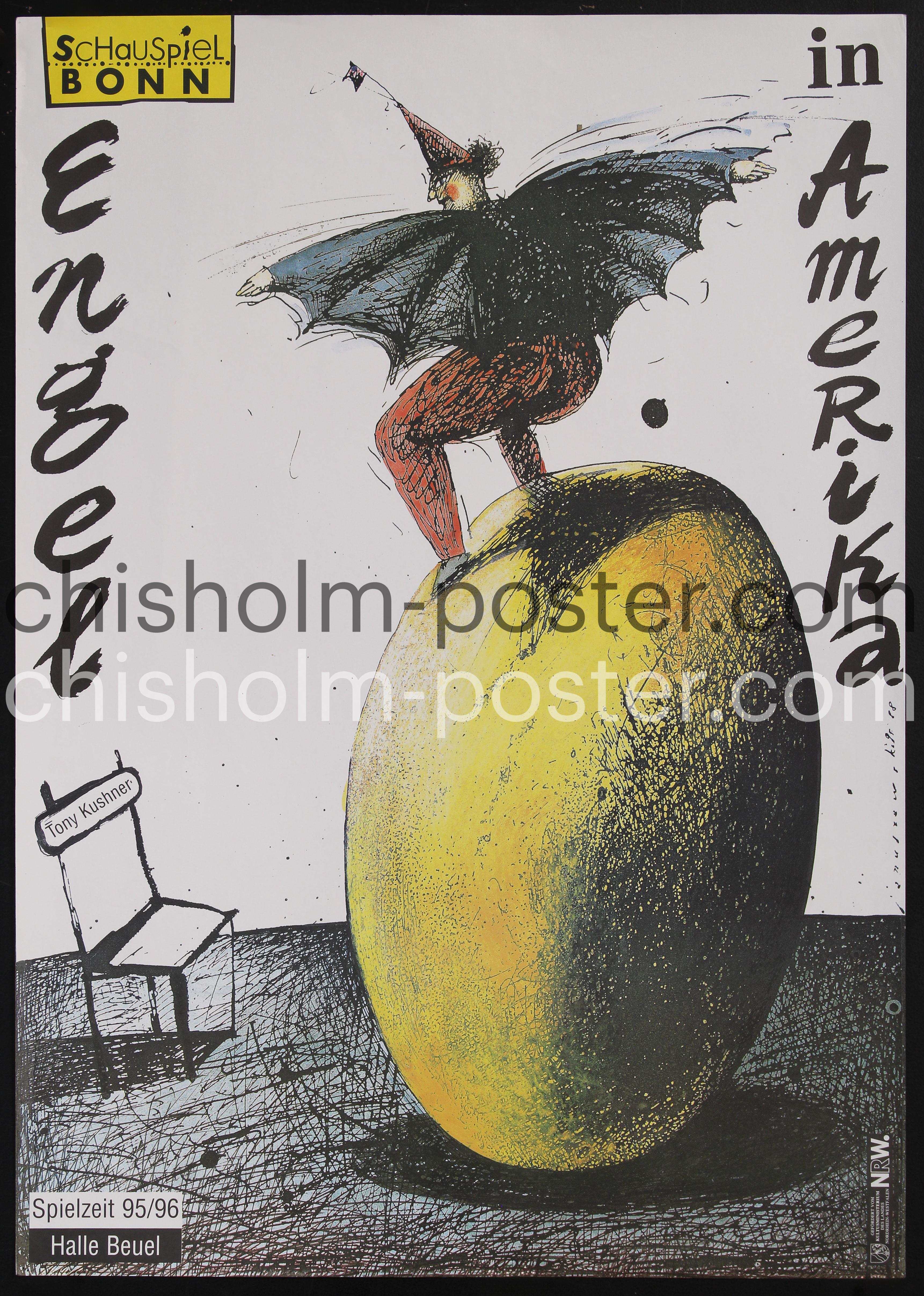Poster from a production from the 1995 / 96 season of Schauspiel Bonn of Angels in America: A Gay Fantasia on National Themes, a 1991 two-part play by American playwright Tony Kushner. Schauspiel Bonn is the drama division of Theater Bonn in Germany, featuring a permanent acting ensemble that produces a diverse repertoire of classical and modern plays.