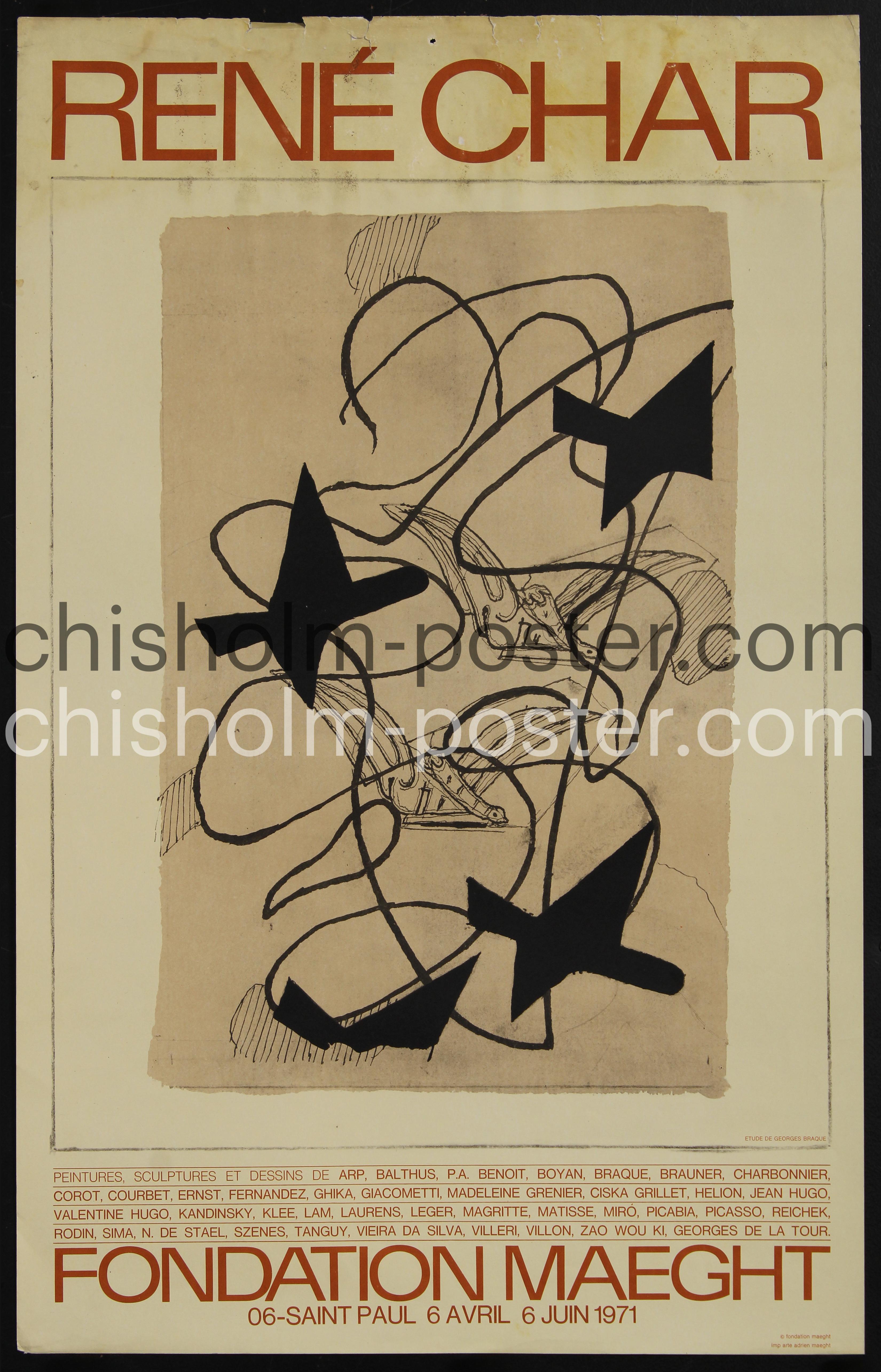 1971 Art exhibition in honor of René Émile Char, a French poet and member of the French Resistance in World War II. Featured artwork is a study by Georges Braque. Other artist included in the show: Arp, Balthus, P.A. Benoit, Boyan, Braque, Brauner, Charbonnier, Corot, Courbet, Ernst, Fernandez, Ghika, Giacometti, Madeleine Grenier, Ciska Grillet, Helion, Jean Hugo Valentine Hugo, Kandinsky, Klee, Lam, Laurens, Leger, Magritte, Matisse, Miro, Picabia,