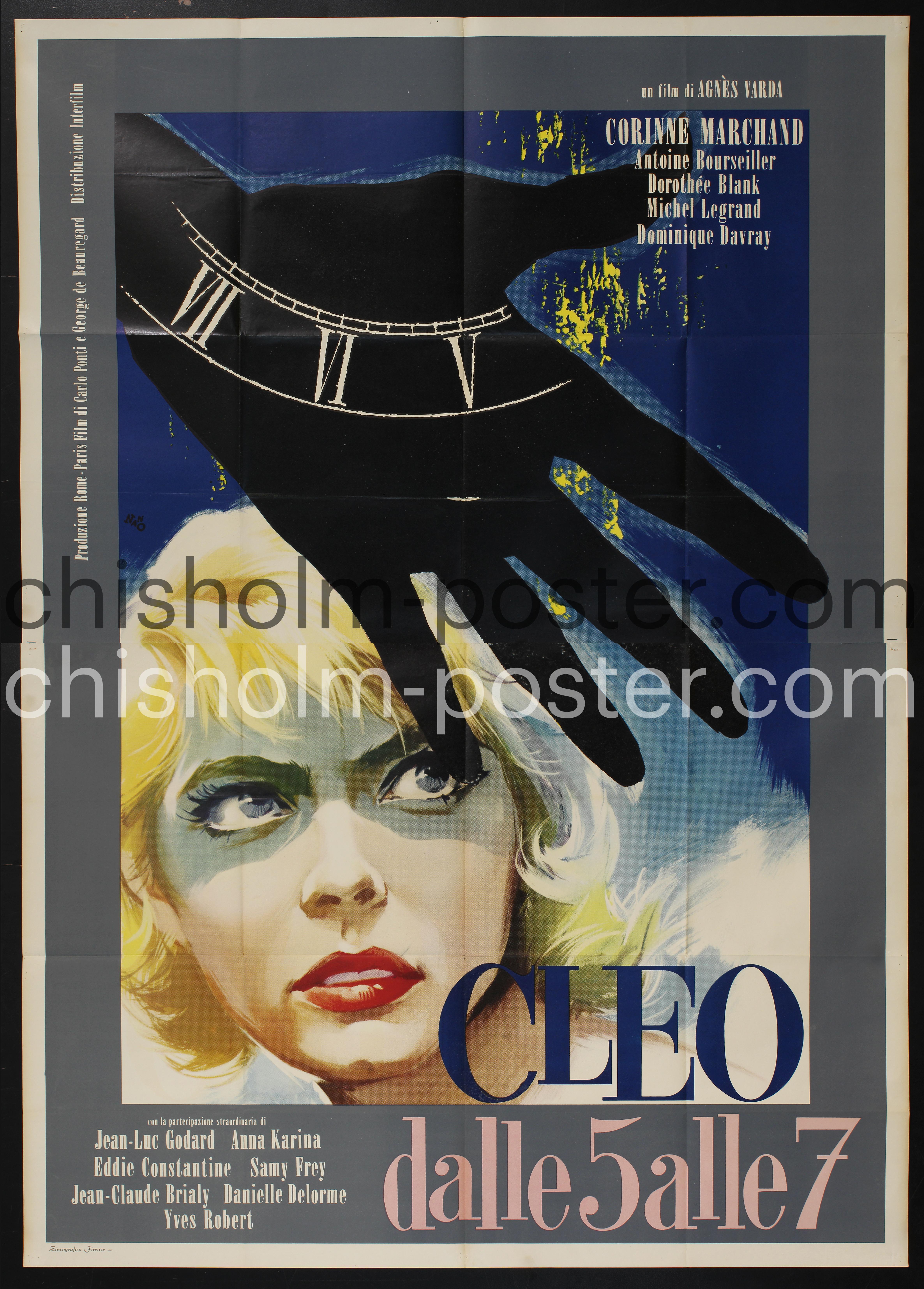 Stunning and hard to find Italian release four-sheet (4 Fogli) poster of the classic 1962 French New Wave drama film "Cléo de 5 à 7" written and directed by Agnès Varda. The film follows Florence, a young singer known professionally as "Cléo Victoire", from 5 p.m. until 6:30 p.m. on June 21, as she waits to hear the results of a biopsy that will possibly confirm a diagnosis of cancer. In 2019, Cléo from 5 to 7 was voted the second greatest film directed by a woman (behind only Jane Campion's The Piano) in a BBC poll of 368 film experts from 84 countries. (Wikipedia)